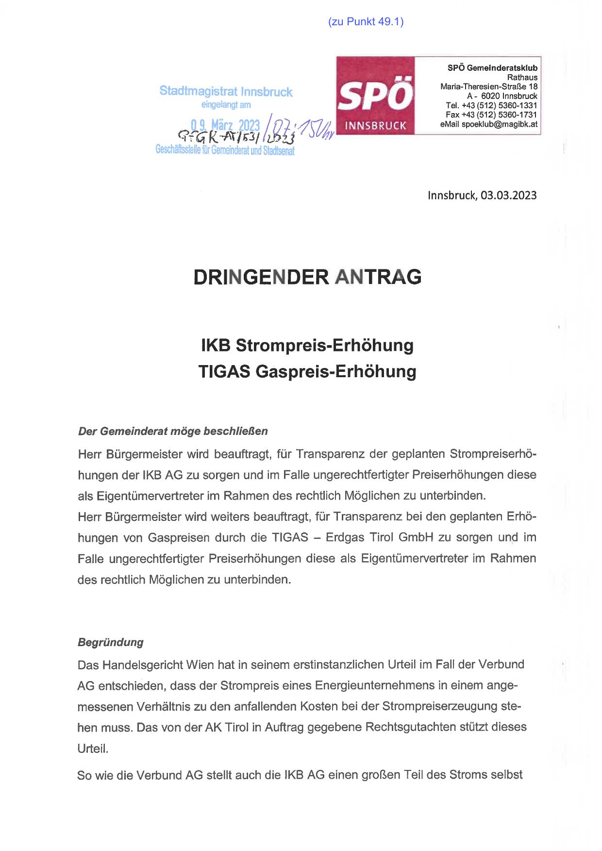 Herr Bürgermeister wird weiters beauftragt, für Transparenz bei den geplanten Erhöhungen von Gaspreisen durch die TIGAS - Erdgas Tirol GmbH zu sorgen unp im