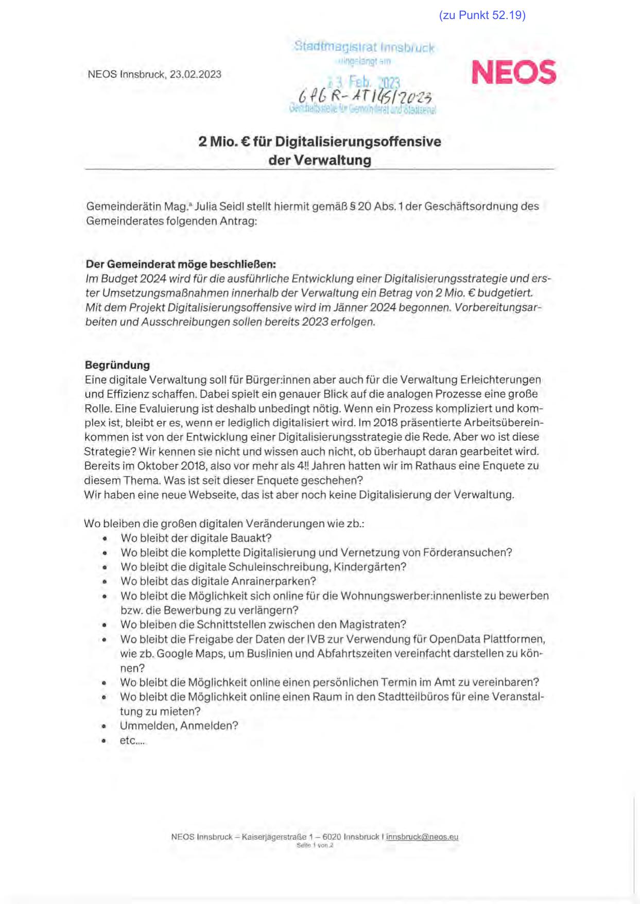 Gemeinderätin Mag. 2 Julia Seidl stellt hiermit gemäß§ 20 Abs.1 der Geschäftsordnung des