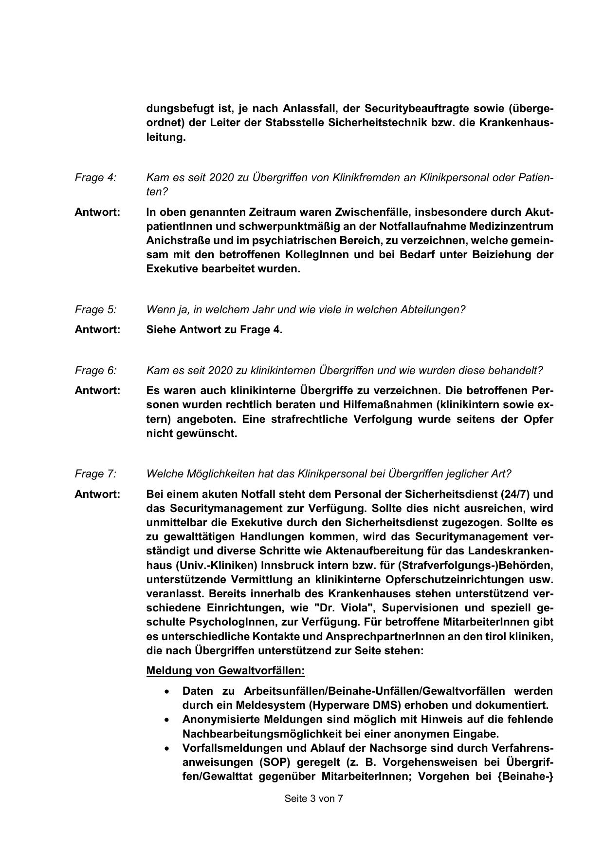 zu gewalttätigen Handlungen kommen, wird das Securitymanagement verständigt und diverse Schritte wie Aktenaufbereitung für das Landeskrankenhaus (Univ.-Kliniken) Innsbruck intern bzw. für (Strafverfolgungs-)Behörden,