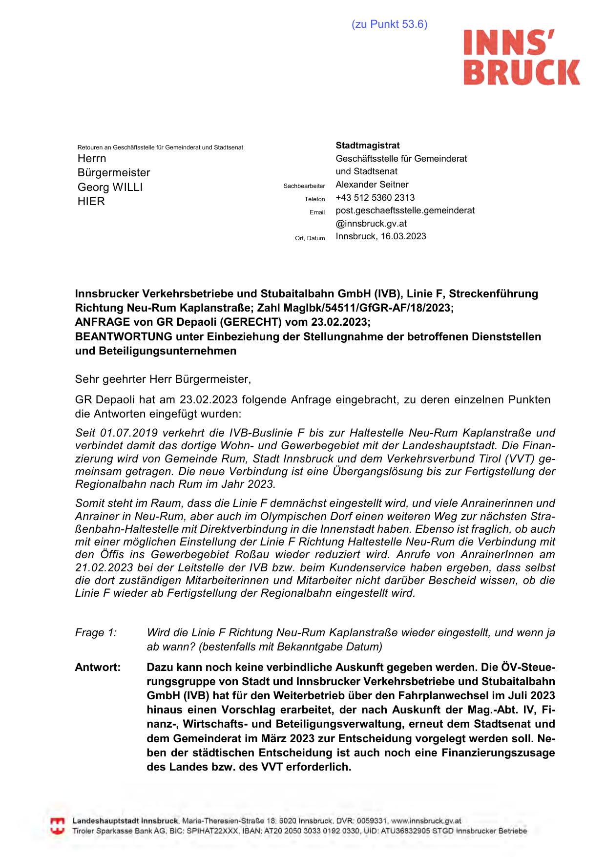 GR Depaoli hat am 23.02.2023 folgende Anfrage eingebracht, zu deren einzelnen Punkten