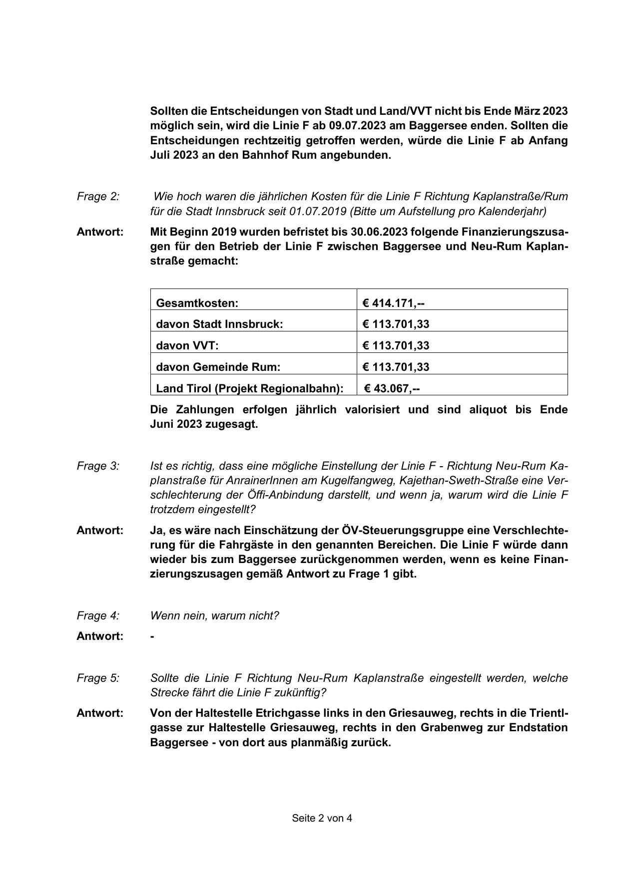 Mit Beginn 2019 wurden befristet bis 30.06.2023 folgende Finanzierungszusagen für den Betrieb der Linie F zwischen Baggersee und Neu-Rum Kaplanstraße gemacht: