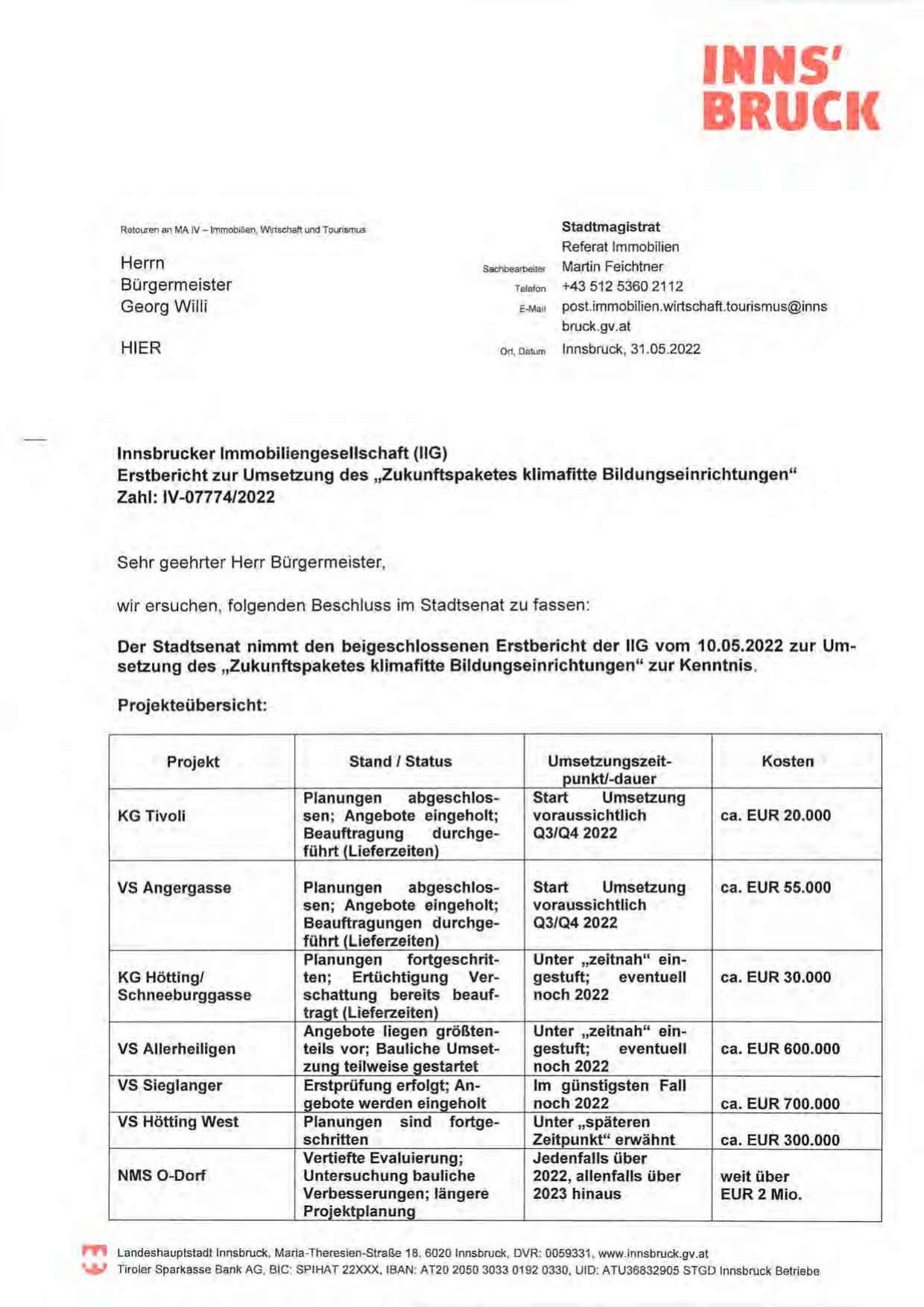 Der Stadtsenat nimmt den beigeschlossenen Erstbericht der IIG vom 10.05.2022 zur Umsetzung des „Zukunftspaketes klimafitte Bildungseinrichtungen" zur Kenntnis .