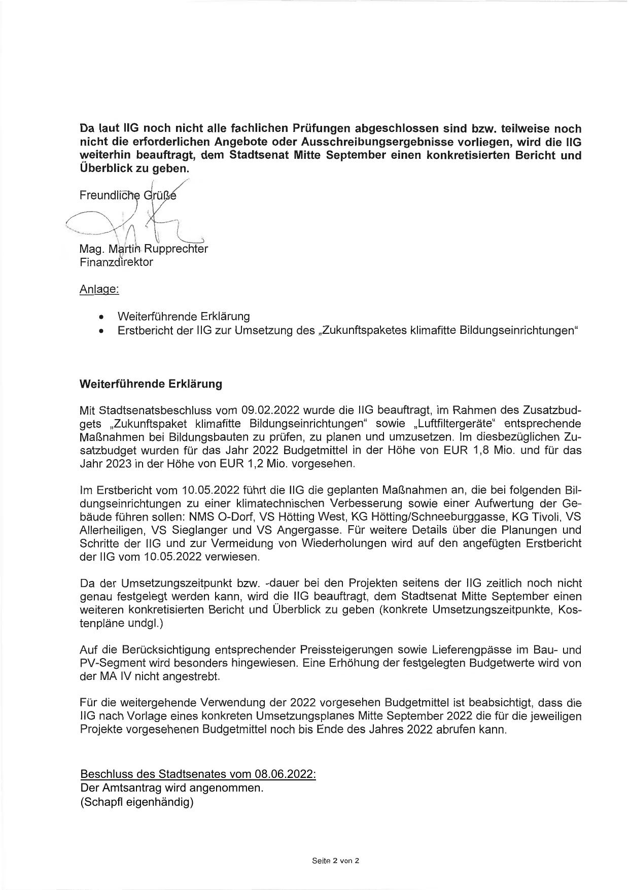 Mit Stadtsenatsbeschluss vom 09.02-2022 wurde die IIG beauftragt, im Rahmen des Zusatzbudgets „Zukunftspaket klimafitte Bildungseinrichtungen" sowie „Luftfiltergeräte" entsprechende