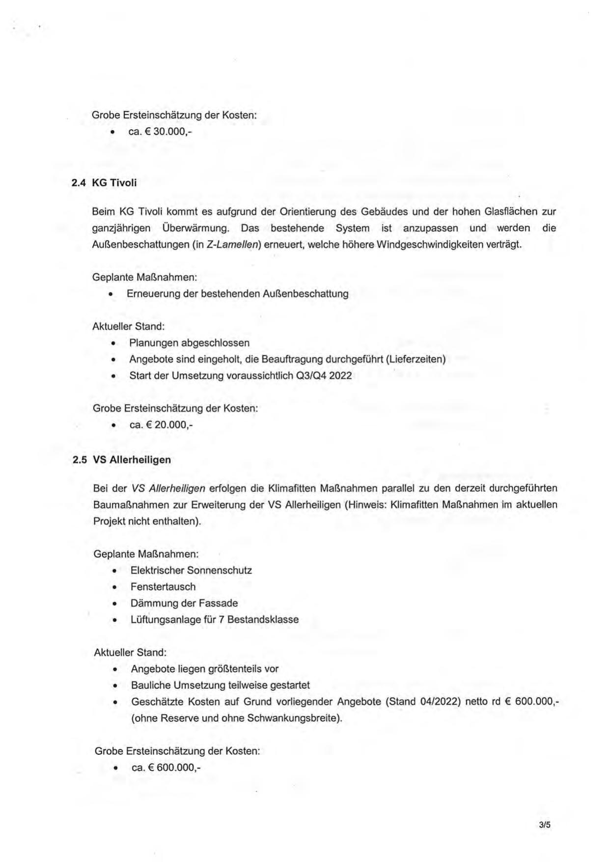 Geschätzte Kosten auf Grund vorliegender Angebote (Stand 04/2022) netto rd € 600.000,(ohne Reserve und ohne Schwankungsbreite).