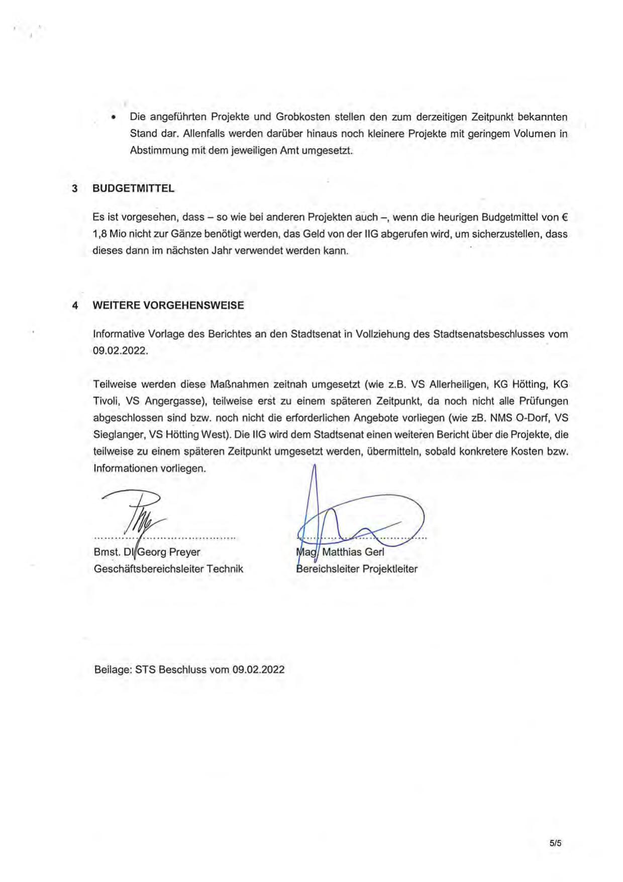 Sieglanger, VS Hötting West). Die IIG wird dem Stadtsenat einen weiteren Bericht über die Projekte, die