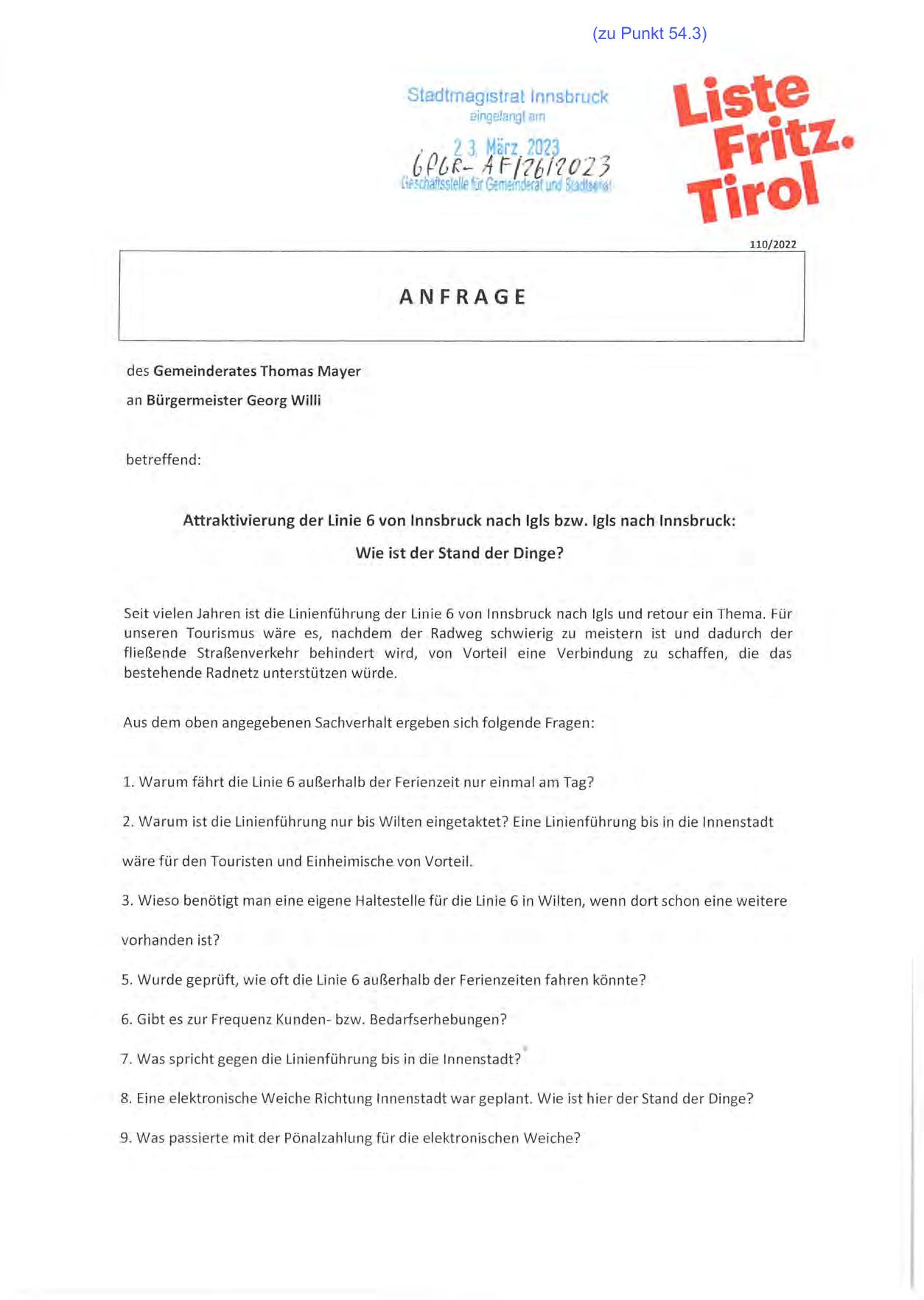 Attraktivierung der Linie 6 von Innsbruck nach Igls bzw. Igls nach Innsbruck: