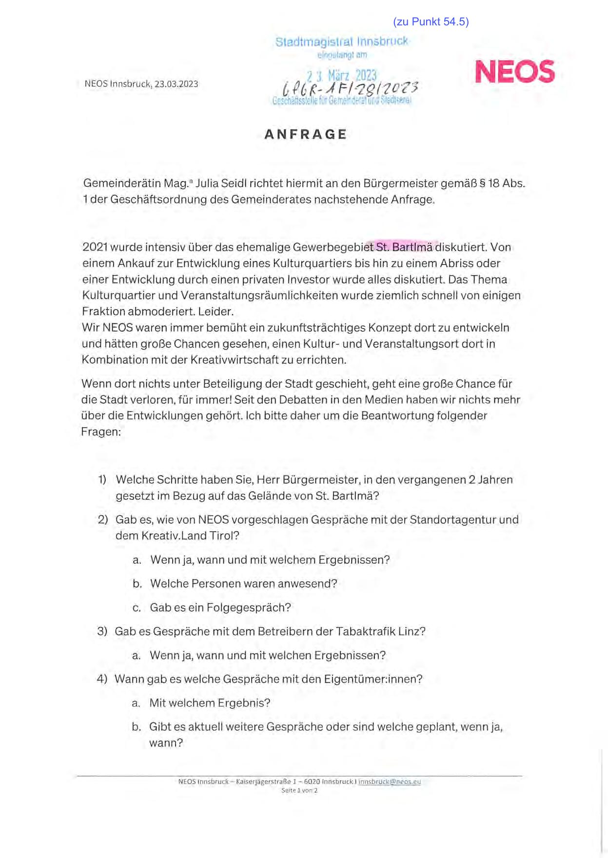 Gemeinderätin Mag.aJulia Seid! richtet hiermit an den Bürgermeister gemäß§ 18 Abs.