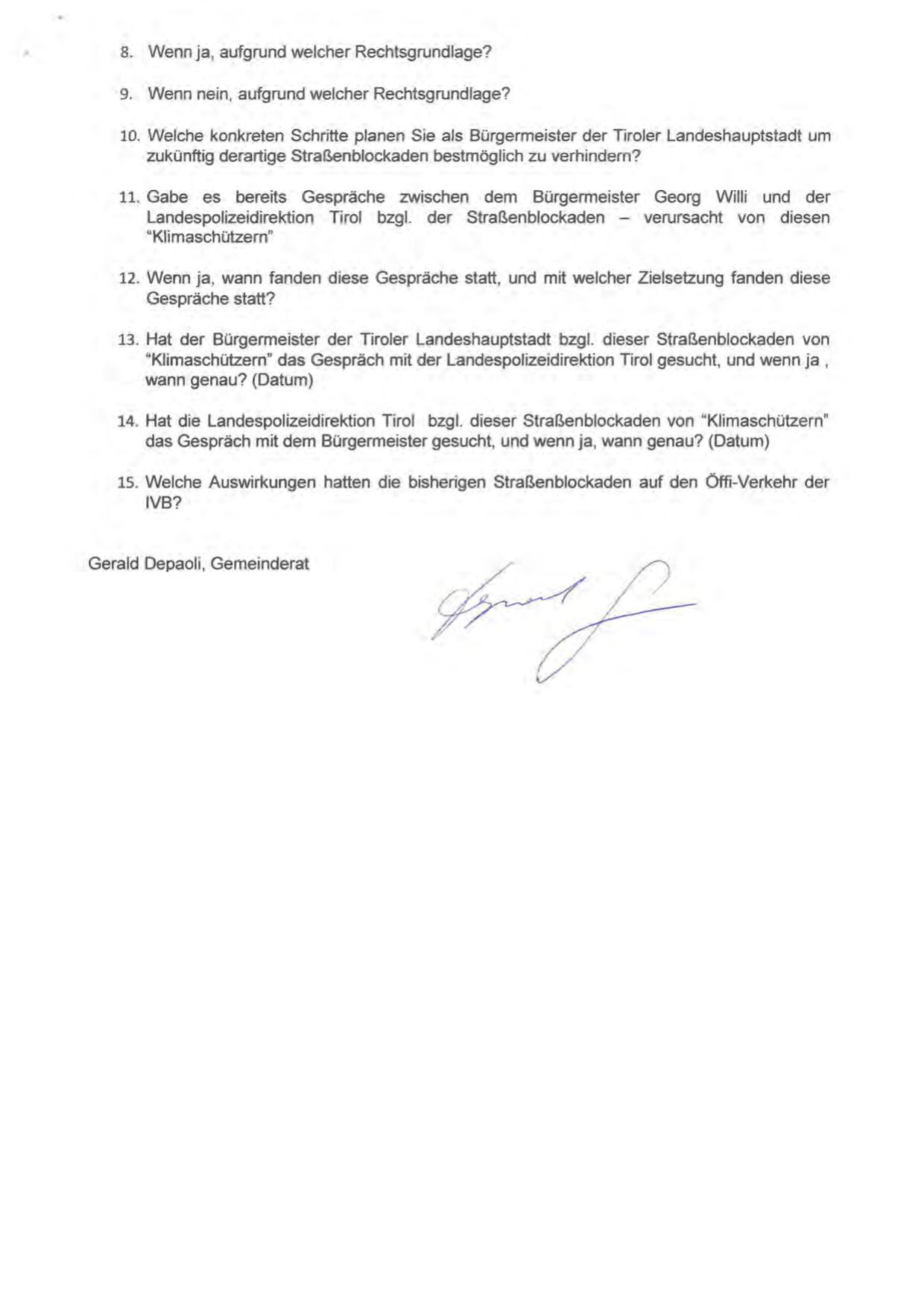 13. Hat der Bürgermeister der Tiroler Landeshauptstadt bzgl. dieser Straßenblockaden von