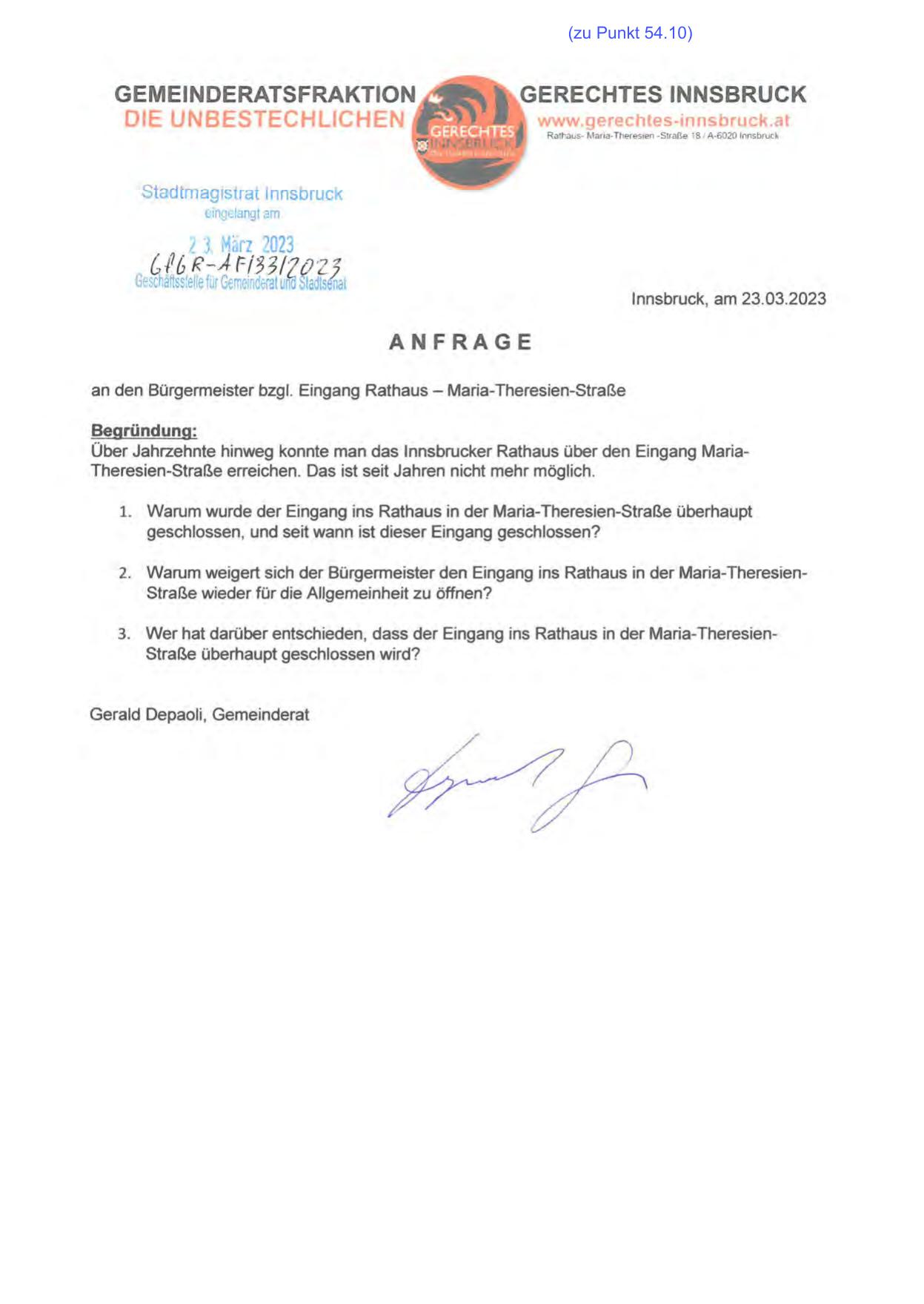 an den Bürgermeister bzgl. Eingang Rathaus - Maria-Theresien-Straße