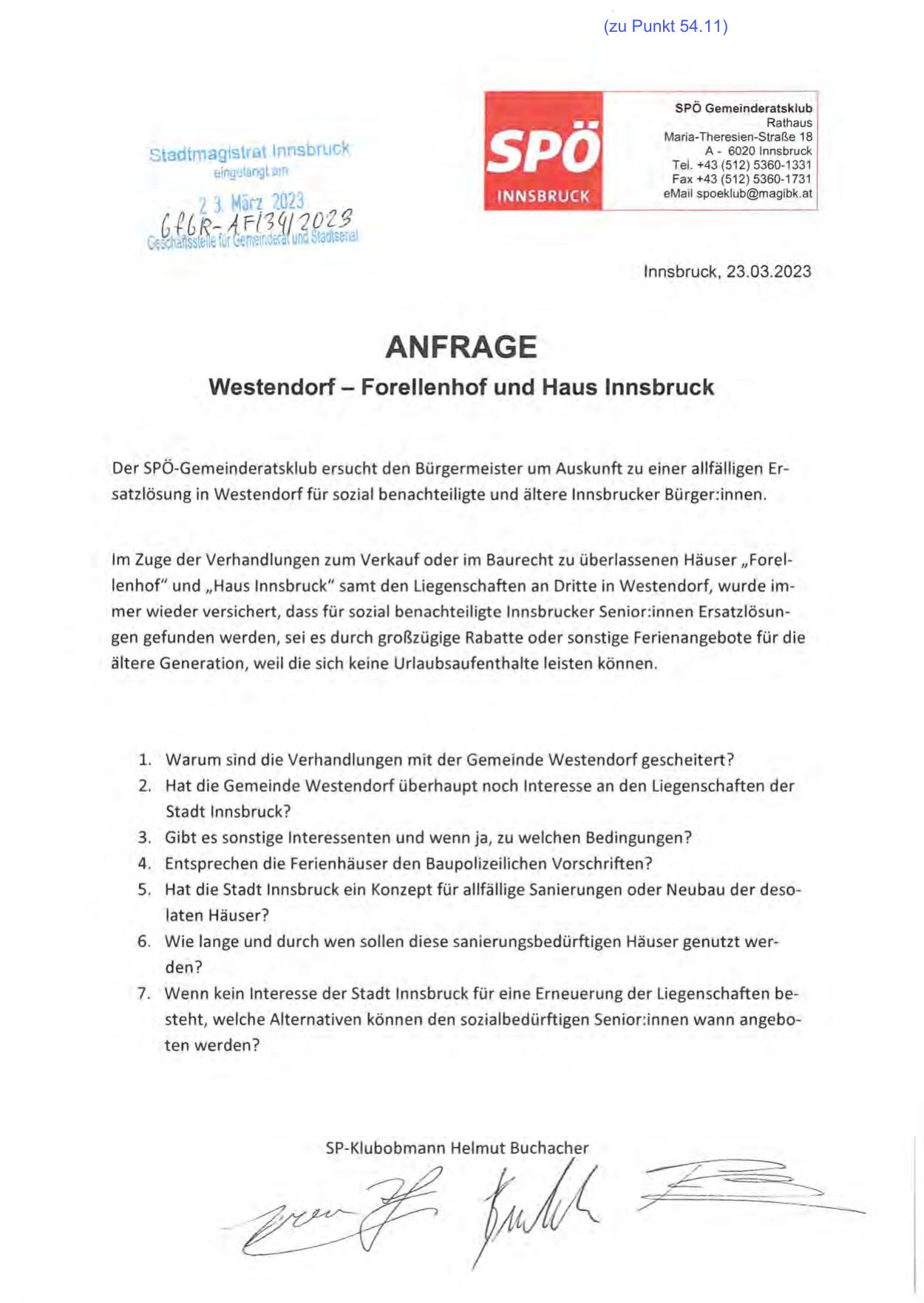 Der SPÖ-Gemeinderatsklub ersucht den Bürgermeister um Auskunft zu einer allfälligen Ersatzlösung in Westendorf für sozial benachteiligte und ältere lnnsbrucker Bürger:innen.