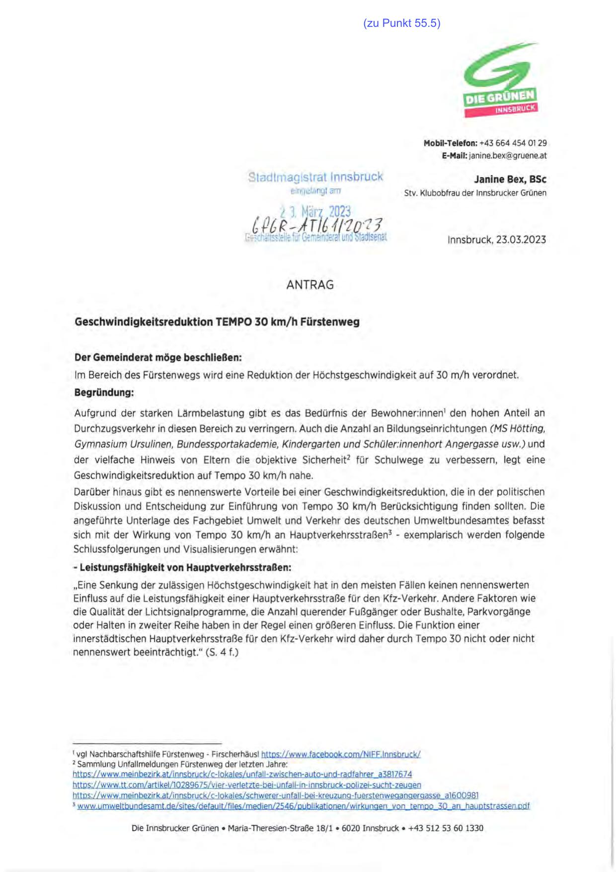 Diskussion und Entscheidung zur Einführung von Tempo 30 km/h Berücksichtigung finden sollten. Die