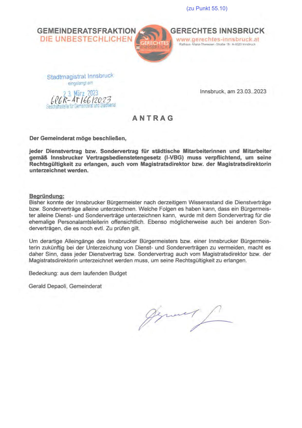 Um derartige Alleingänge des lnnsbrucker Bürgermeisters bzw. einer lnnsbrucker Bürgermeisterin zukünftig bei der Unterzeichung von Dienst- und Sonderverträgen zu vermeiden, macht es