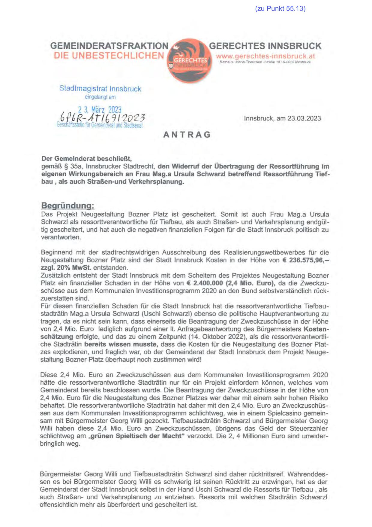 von 2,4 Mio. Euro lediglich aufgrund einer lt. Anfragebeantwortung des Bürgermeisters Kostenschätzung erfolgte, und das zu einem Zeitpunkt (14. Oktober 2022), als die ressortverantwortliche Stadträtin bereits wissen musste, dass die Kosten für die Neugestaltung des Bozner Platzes explodieren, und fraglich war, ob der Gemeinderat der Stadt Innsbruck dem Projekt Neugestaltung Bozner Platz überhaupt noch zustimmen wird!