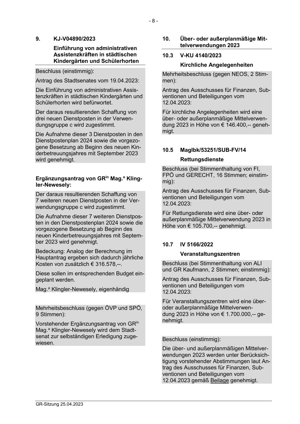 Mehrheitsbeschluss (gegen NEOS, 2 Stimmen):