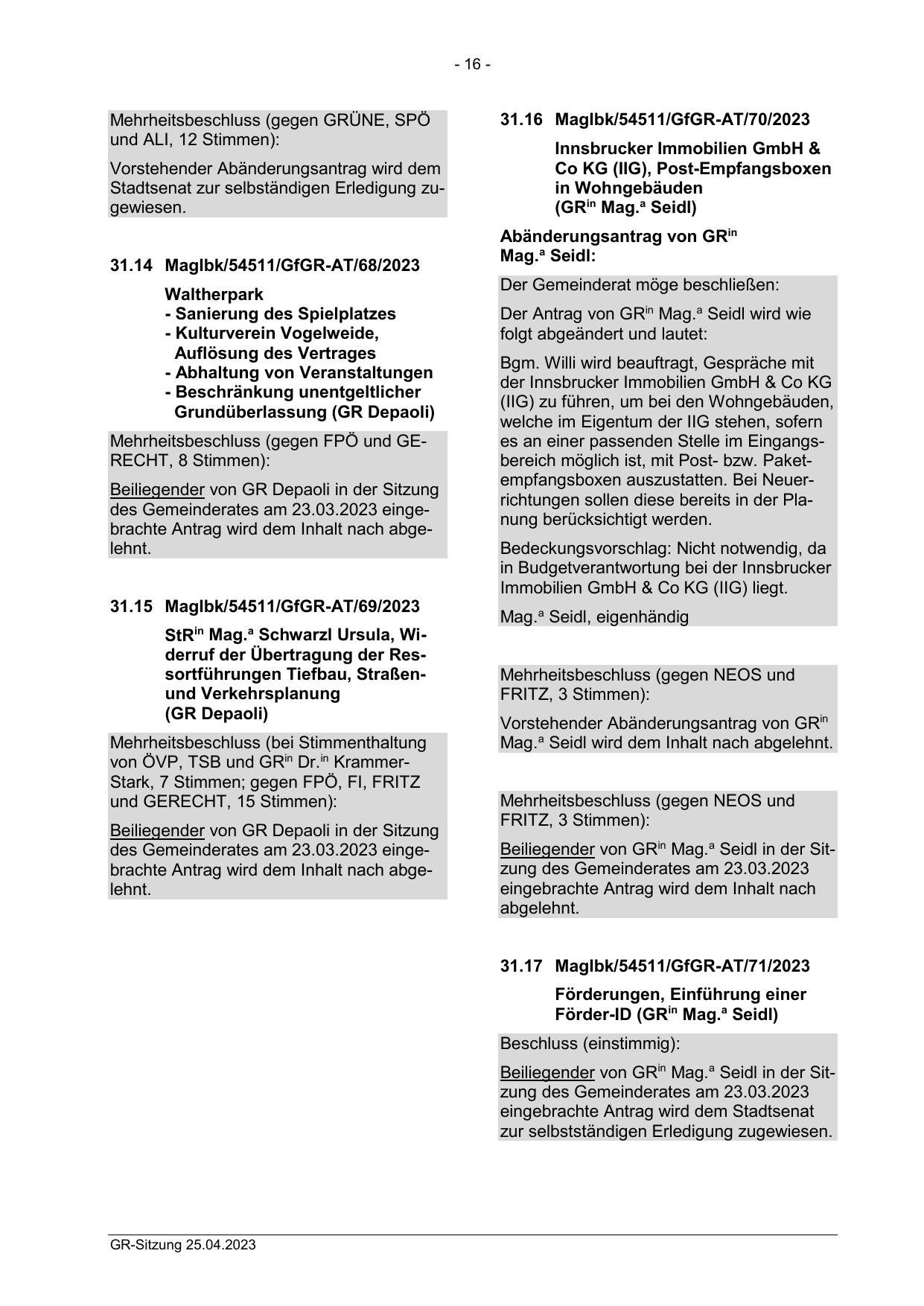 Mehrheitsbeschluss (gegen FPÖ und GERECHT, 8 Stimmen):