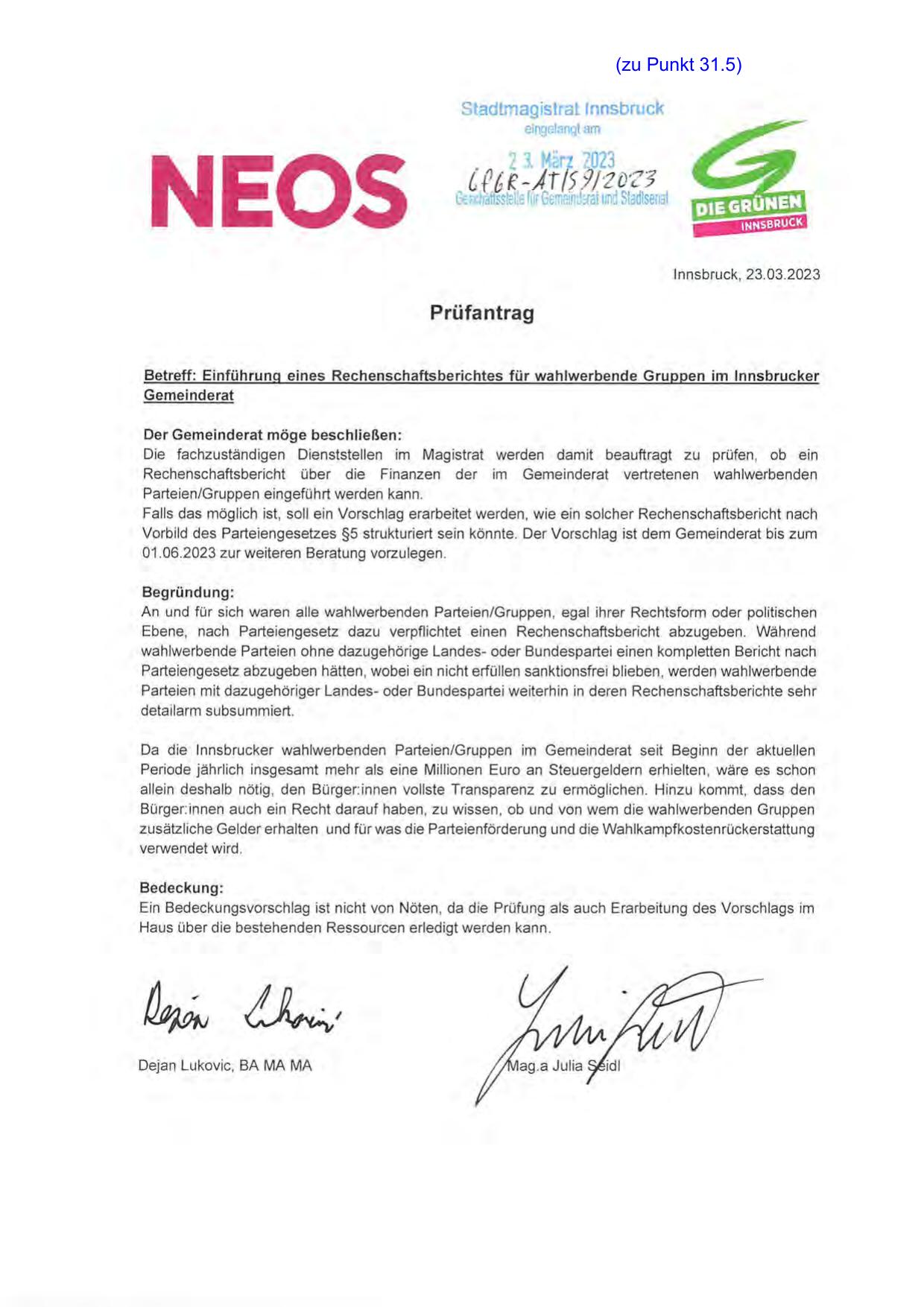 Betreff: Einführung eines Rechenschaftsberichtes für wahlwerbende Gruppen im lnnsbrucker