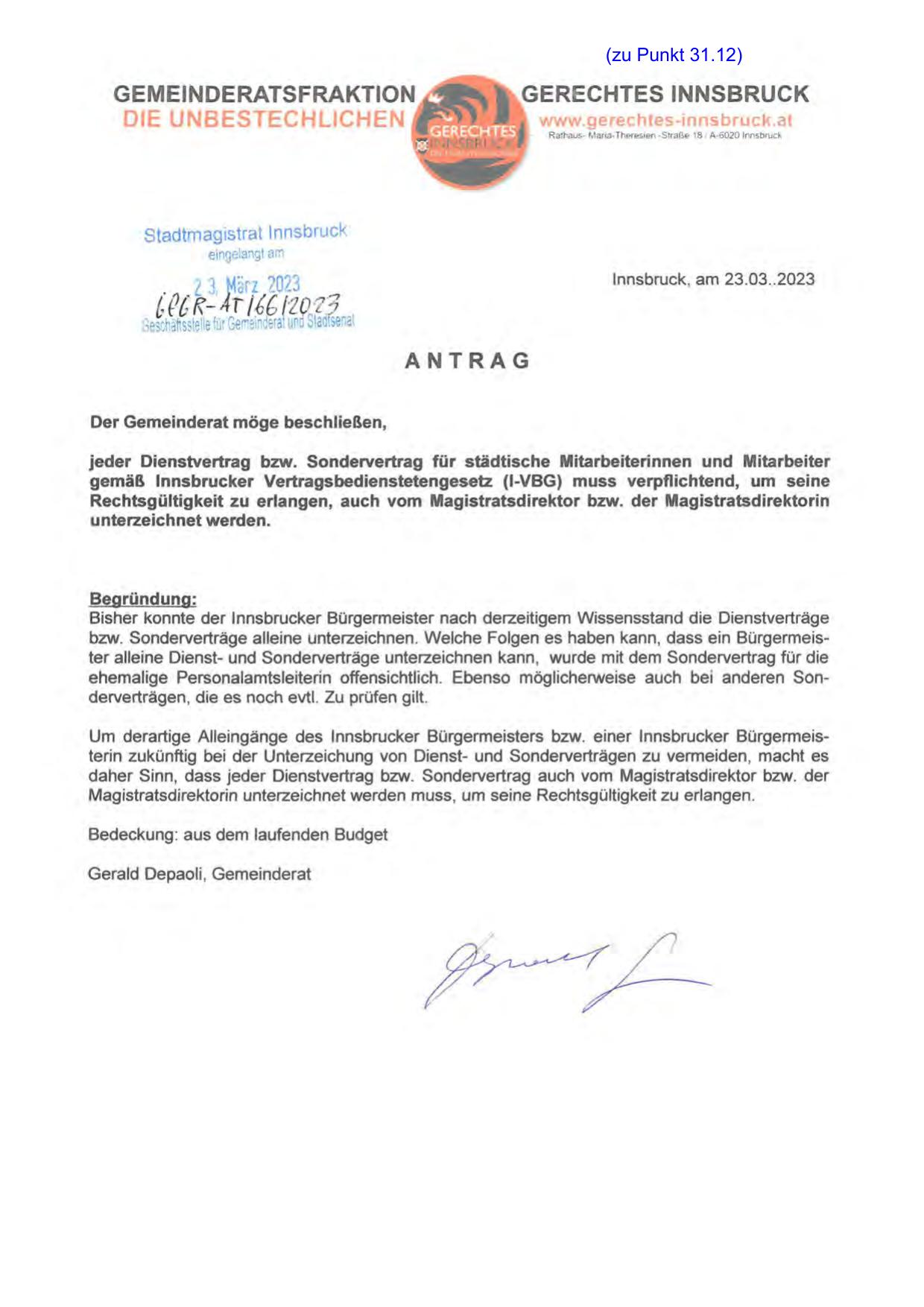 Um derartige Alleingänge des lnnsbrucker Bürgermeisters bzw. einer lnnsbrucker Bürgermeisterin zukünftig bei der Unterzeichung von Dienst- und Sonderverträgen zu vermeiden, macht es