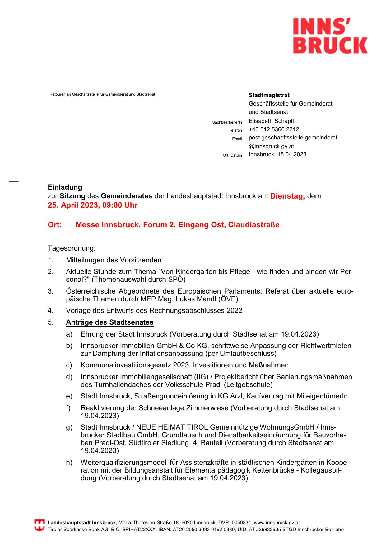 zur Sitzung des Gemeinderates der Landeshauptstadt Innsbruck am Dienstag, dem