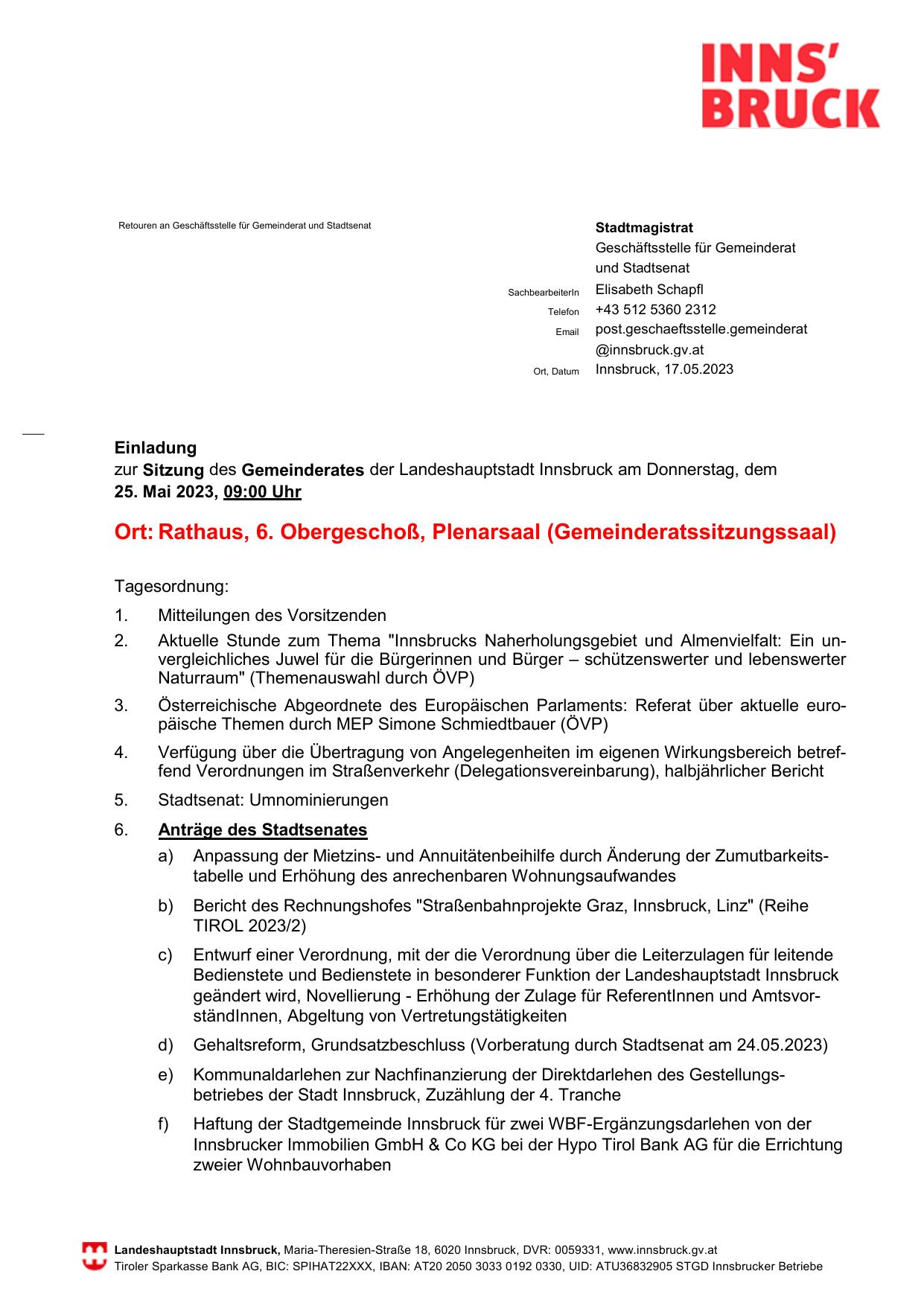 zur Sitzung des Gemeinderates der Landeshauptstadt Innsbruck am Donnerstag, dem