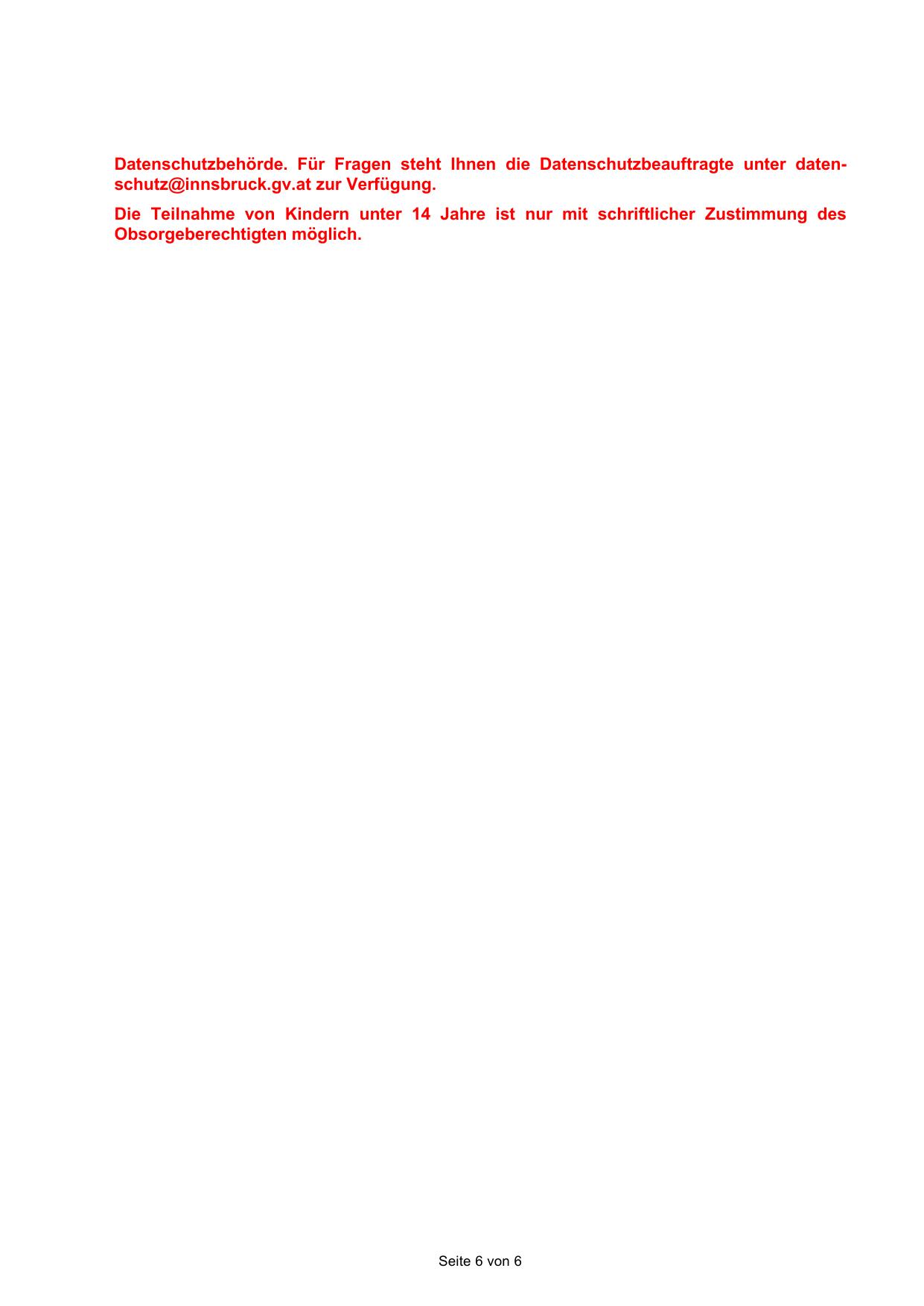 Datenschutzbehörde. Für Fragen steht Ihnen die Datenschutzbeauftragte unter datenschutz@innsbruck.gv.at zur Verfügung.