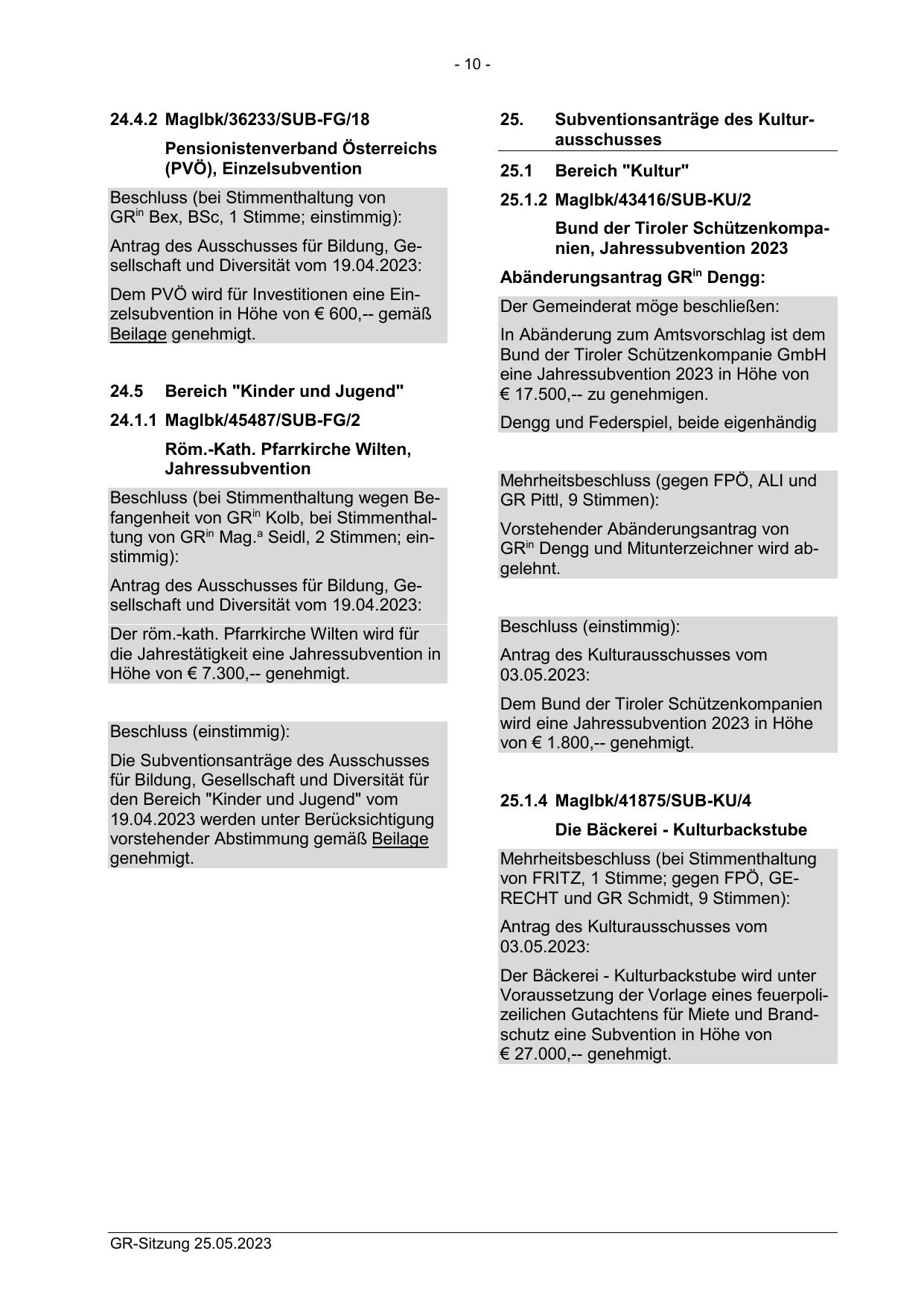 von FRITZ, 1 Stimme; gegen FPÖ, GERECHT und GR Schmidt, 9 Stimmen):