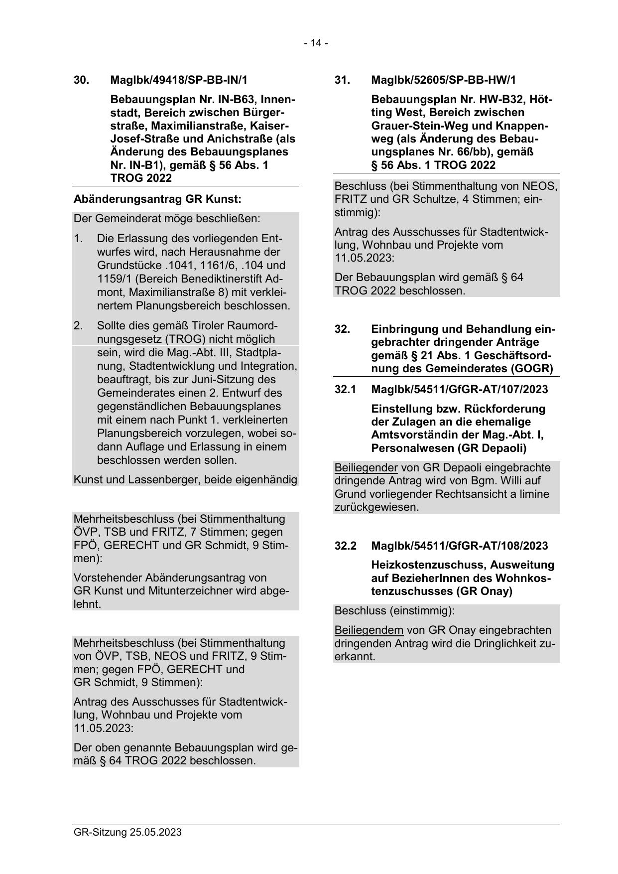 von ÖVP, TSB, NEOS und FRITZ, 9 Stimmen; gegen FPÖ, GERECHT und