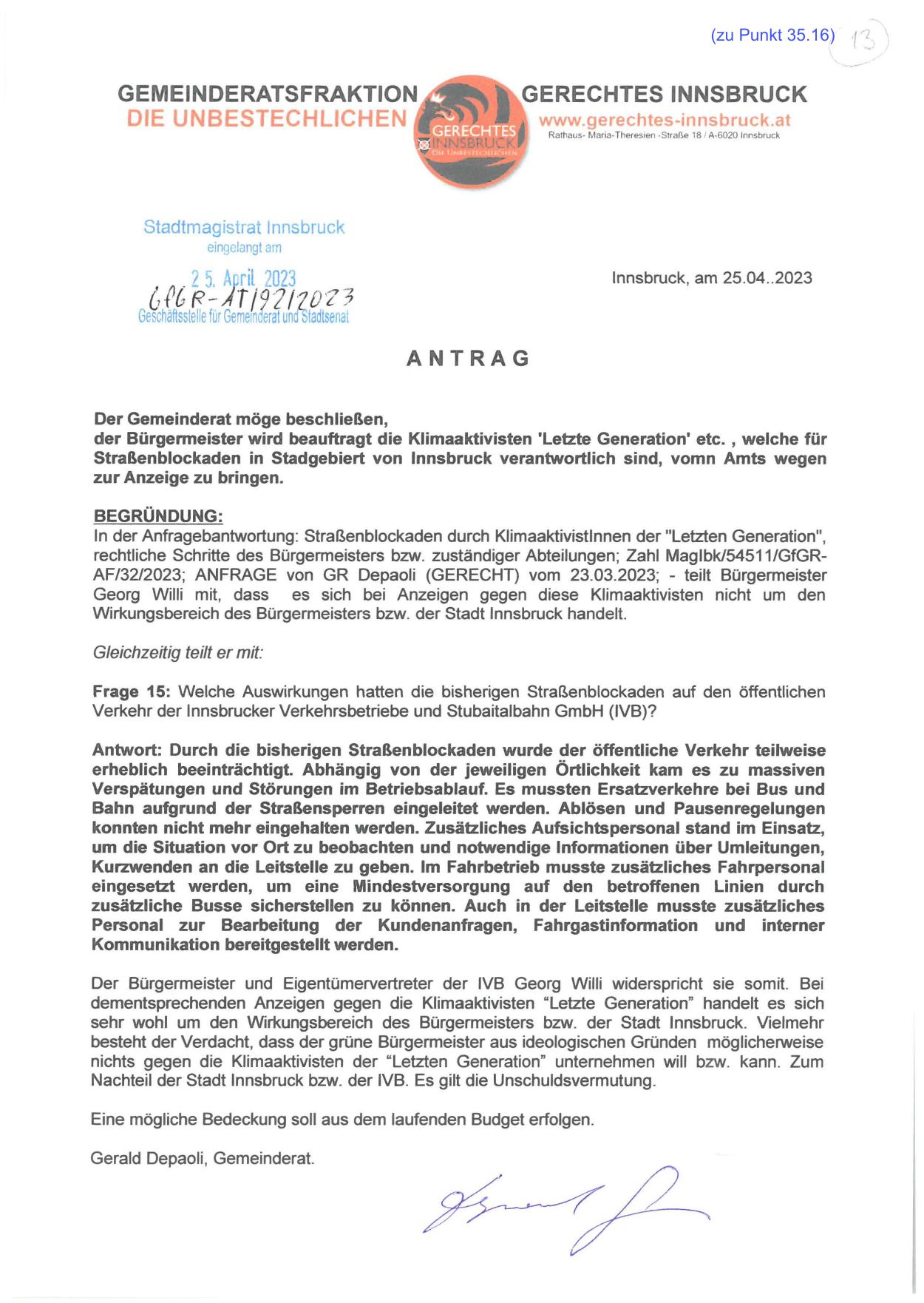 rechtliche Schritte des Bürgermeisters bzw. zuständiger Abteilungen; Zahl Maglbk/54511/GfGRAF/32/2023; ANFRAGE von GR Depaoli (GERECHT) vom 23.03.2023; - teilt Bürgermeister