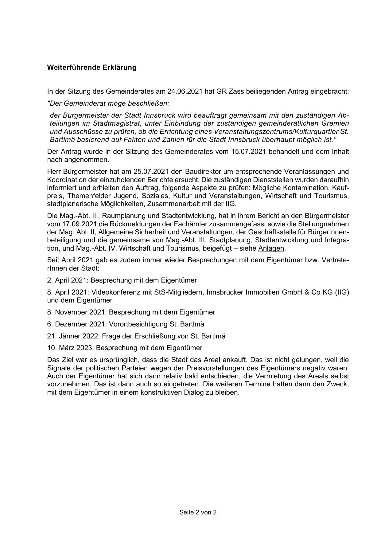 der Bürgermeister der Stadt Innsbruck wird beauftragt gemeinsam mit den zuständigen Abteilungen im Stadtmagistrat, unter Einbindung der zuständigen gemeinderätlichen Gremien