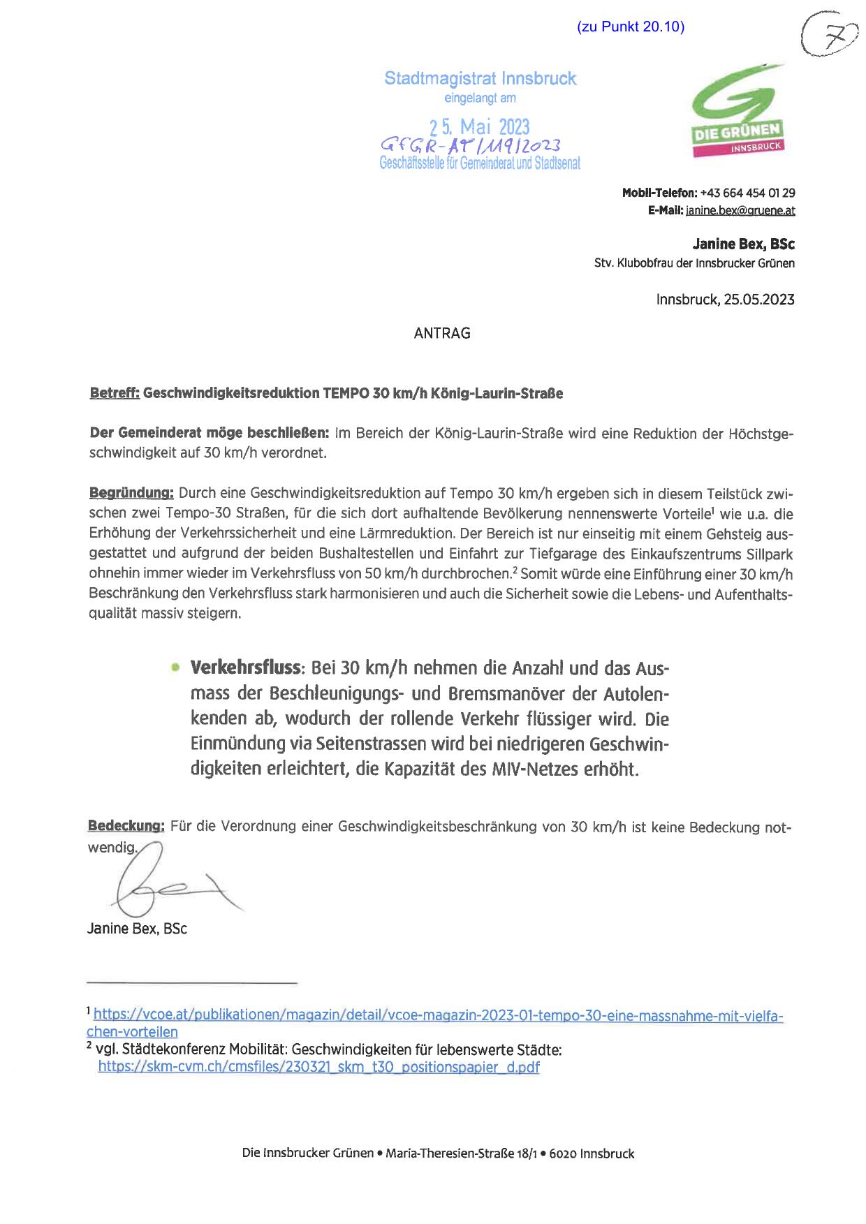 Der Gemeinderat möge beschließen: Im Bereich der König-Laurin-Straßewird eine Reduktion der Höchstgeschwindigkeitauf 30 km/h verordnet.