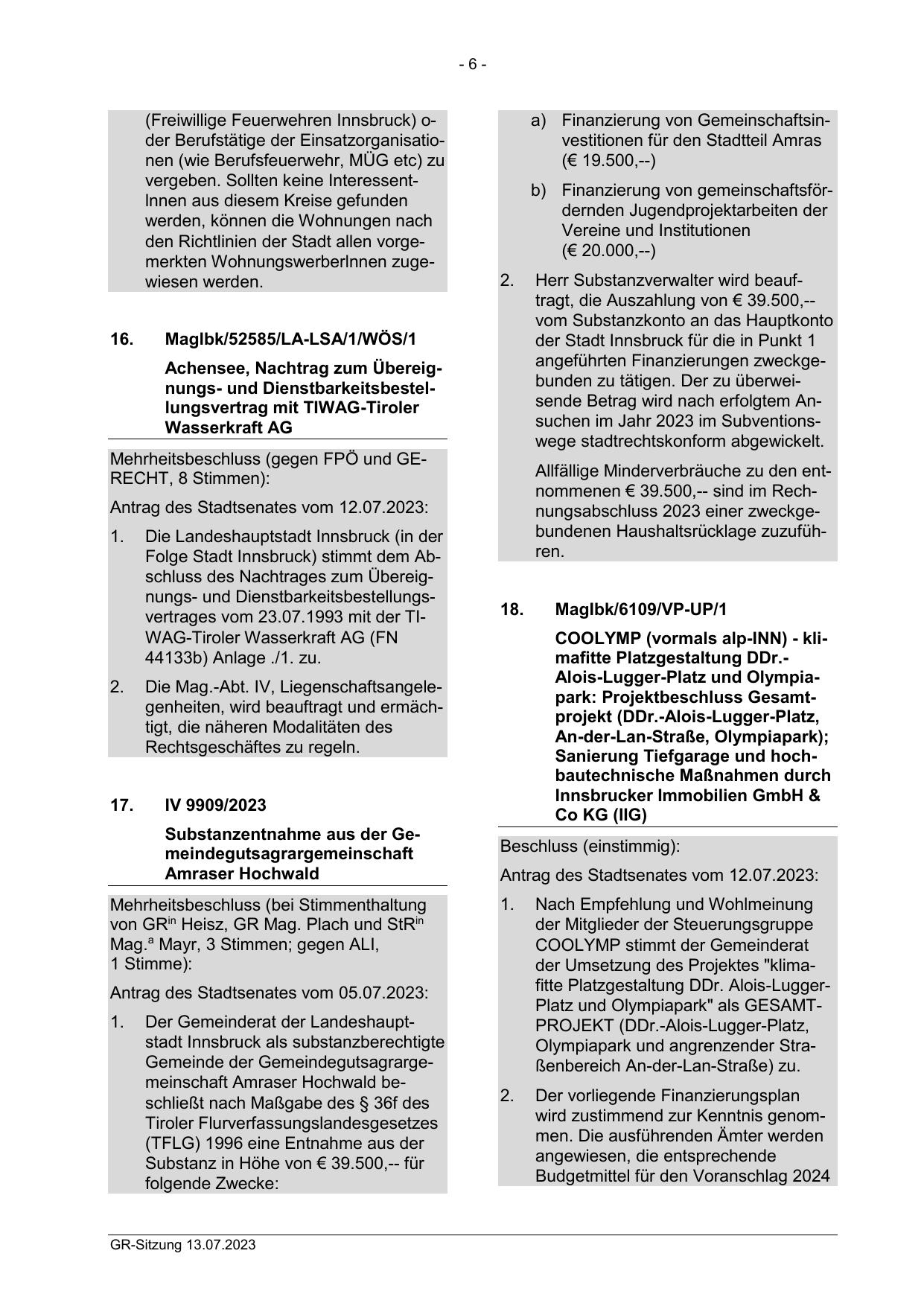 Mehrheitsbeschluss (gegen FPÖ und GERECHT, 8 Stimmen):