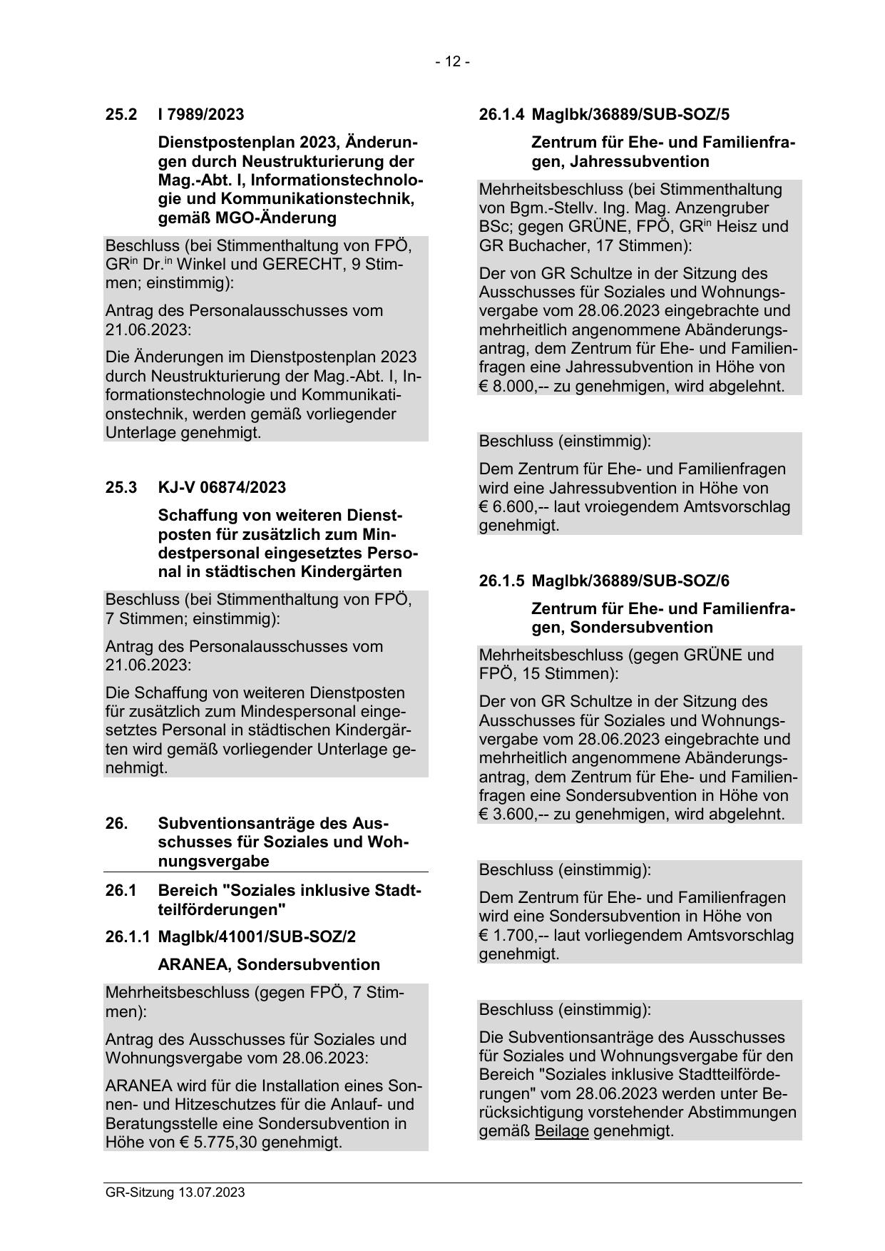 Mehrheitsbeschluss (gegen FPÖ, 7 Stimmen):