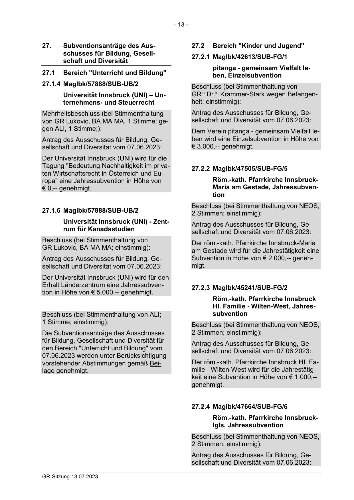 Der röm.-kath. Pfarrkirche Innsbruck HI. Familie - Wilten-West wird für die Jahrestätigkeit eine Subvention in Höhe von € 1.000,-genehmigt.