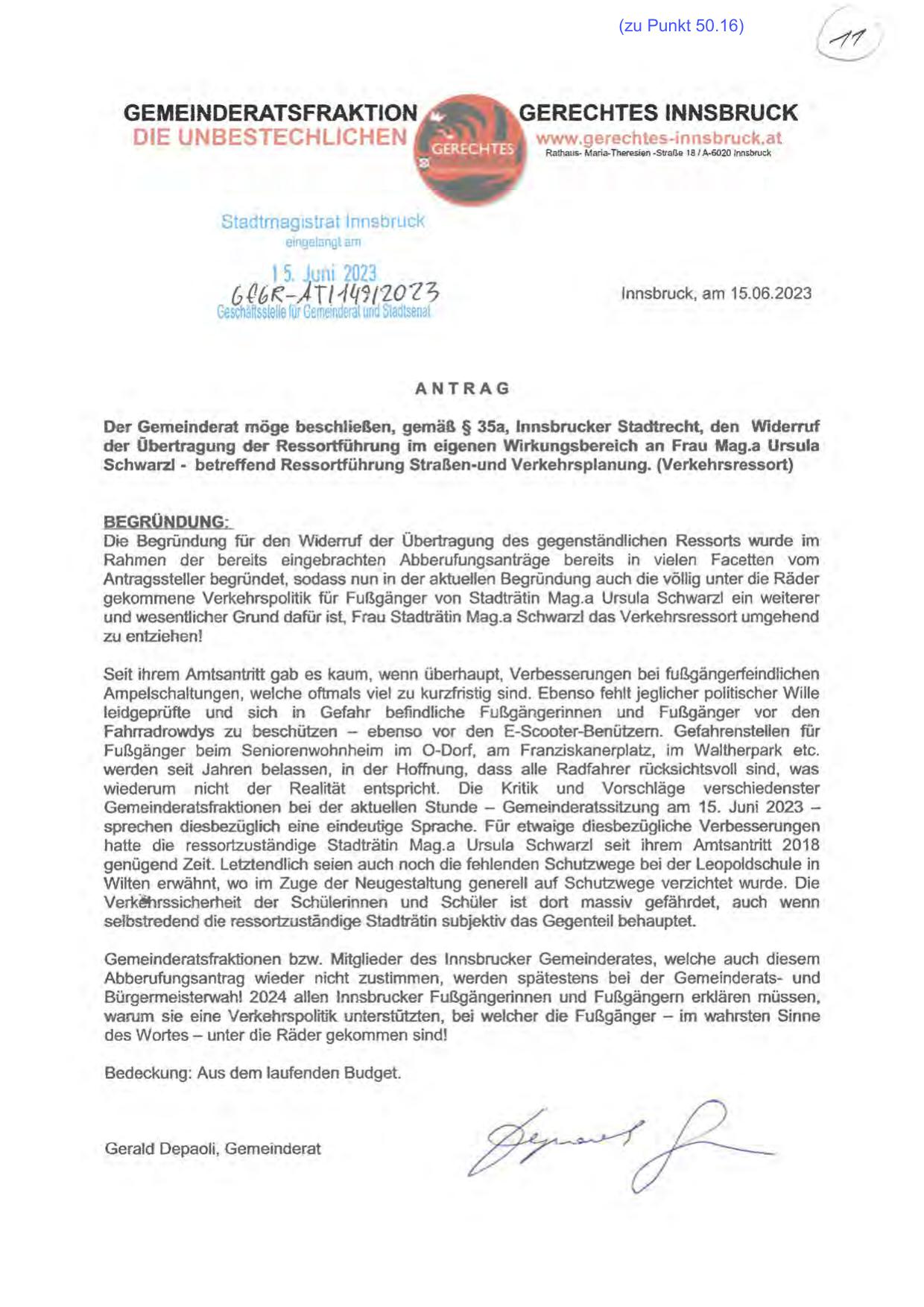 Der Gemeinderat möge beschließen, gemäß § 35a, lnnsbrucker Stadtrecht, den Widerruf