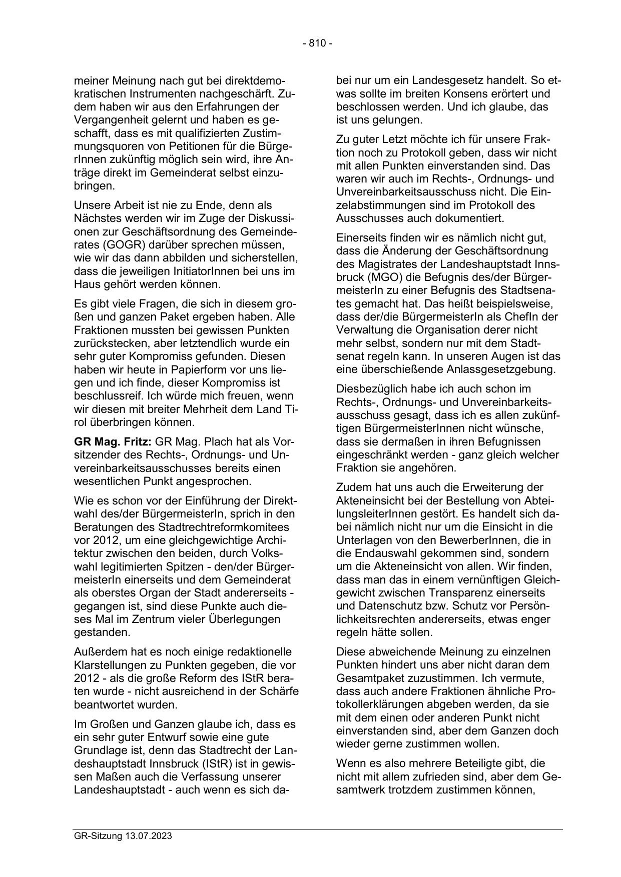 GR Mag. Fritz: GR Mag. Plach hat als Vorsitzender des Rechts-, Ordnungs- und Unvereinbarkeitsausschusses bereits einen