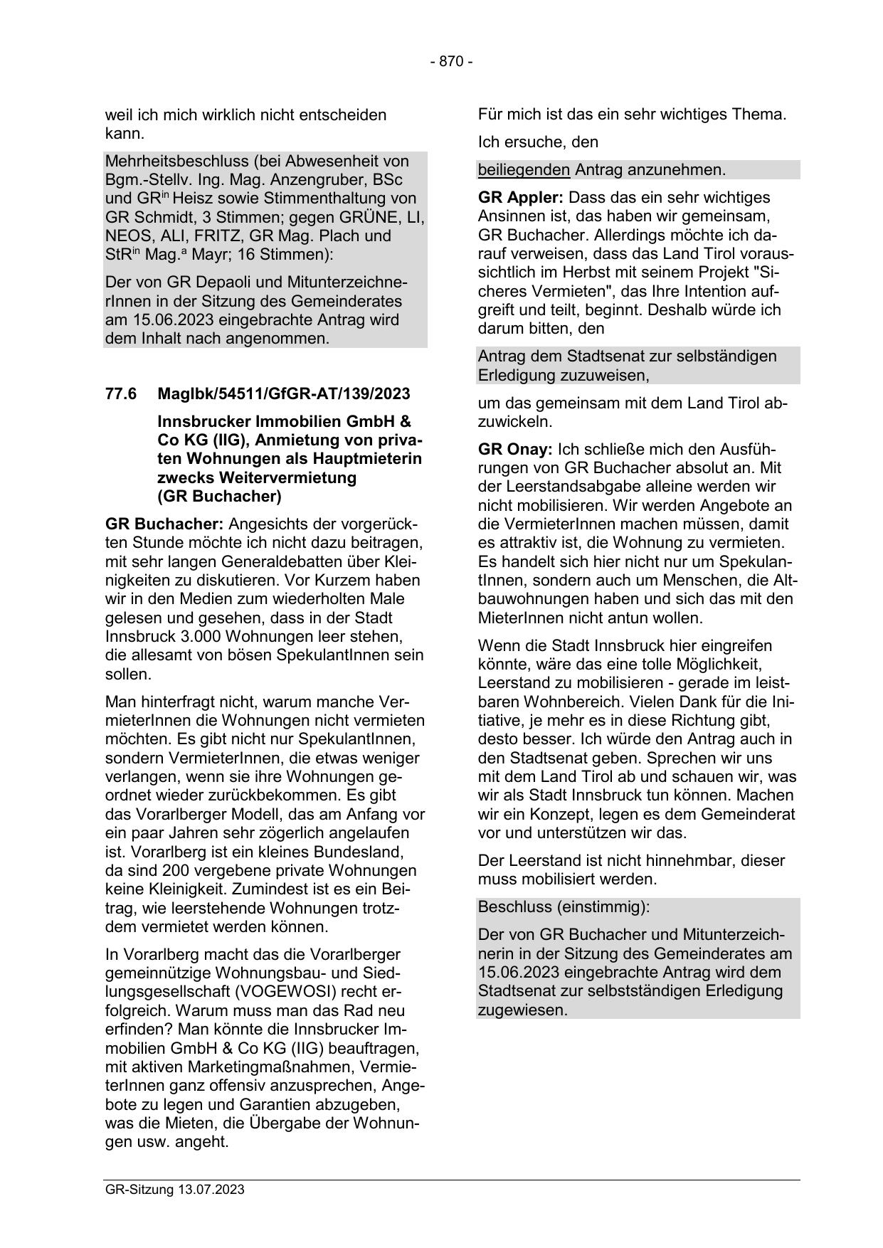 GR Buchacher. Allerdings möchte ich darauf verweisen, dass das Land Tirol voraussichtlich im Herbst mit seinem Projekt "Sicheres Vermieten", das Ihre Intention aufgreift und teilt, beginnt. Deshalb würde ich