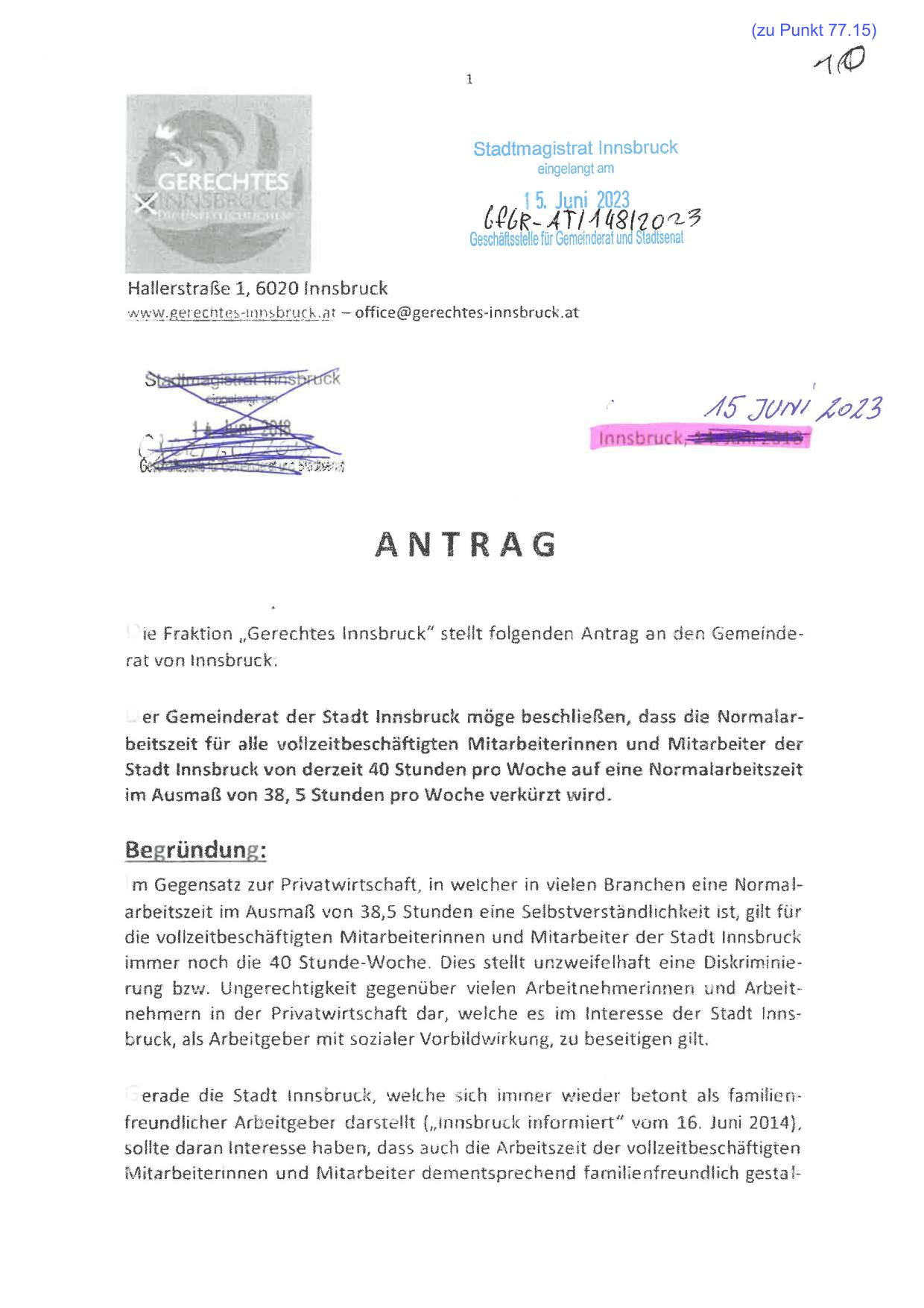 er Gemeinderat der Stadt Innsbruck möge beschll2ßen> dass dia Normalarbeitszeit für aHe voHzeitbeschäftigten Mitarbeiterinnen und Mit~rbeiter der