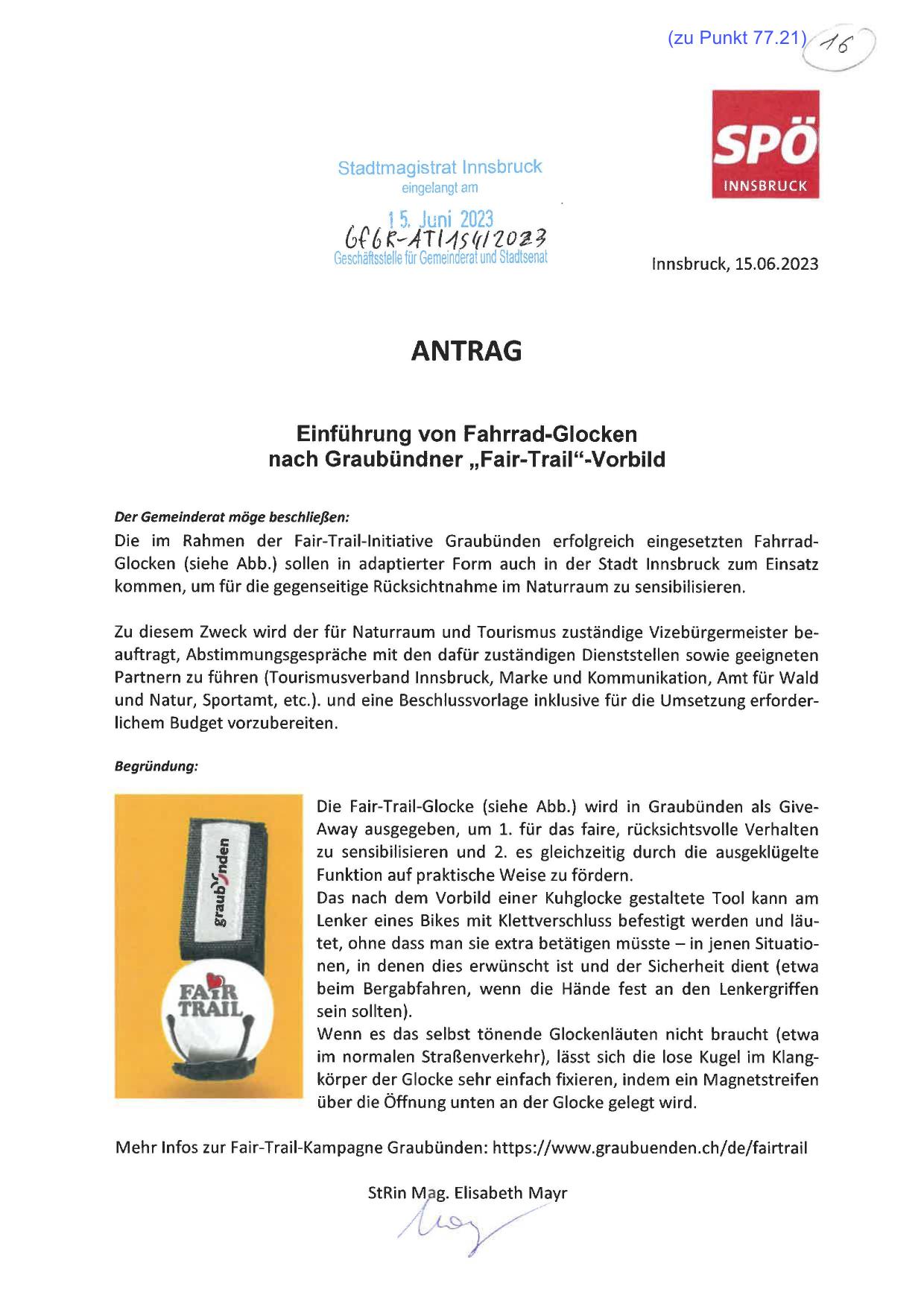 Die im Rahmen der Fair-Trail-lnitiative Graubünden erfolgreich eingesetzten FahrradGlocken (siehe Abb.) sollen in adaptierter Form auch in der Stadt Innsbruck zum Einsatz