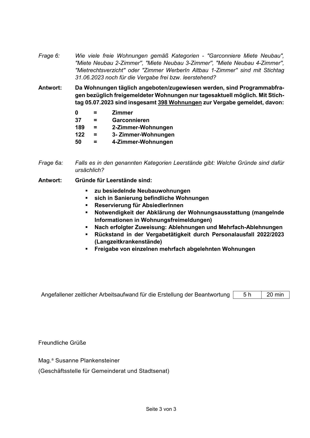 Da Wohnungen täglich angeboten/zugewiesen werden, sind Programmabfragen bezüglich freigemeldeter Wohnungen nur tagesaktuell möglich. Mit Stichtag 05.07.2023 sind insgesamt 398 Wohnungen zur Vergabe gemeldet, davon: