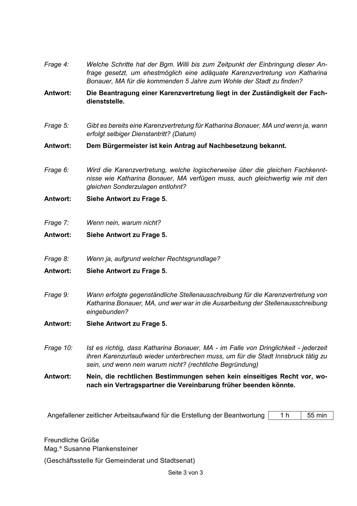 Welche Schritte hat der Bgm. Willi bis zum Zeitpunkt der Einbringung dieser Anfrage gesetzt, um ehestmöglich eine adäquate Karenzvertretung von Katharina