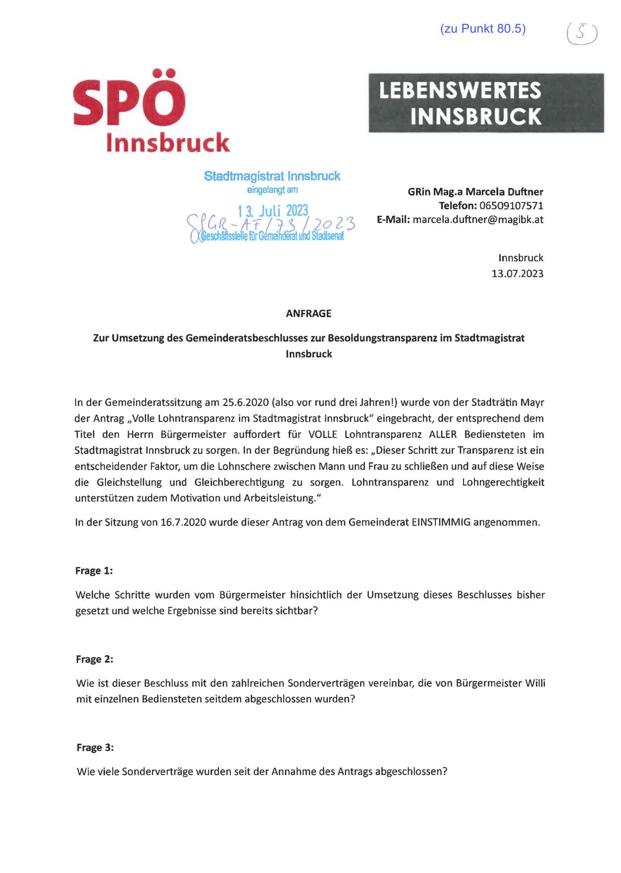 der Antrag „Volle Lohntransparenz im Stadtmagistrat Innsbruck" eingebracht, der entsprechend dem