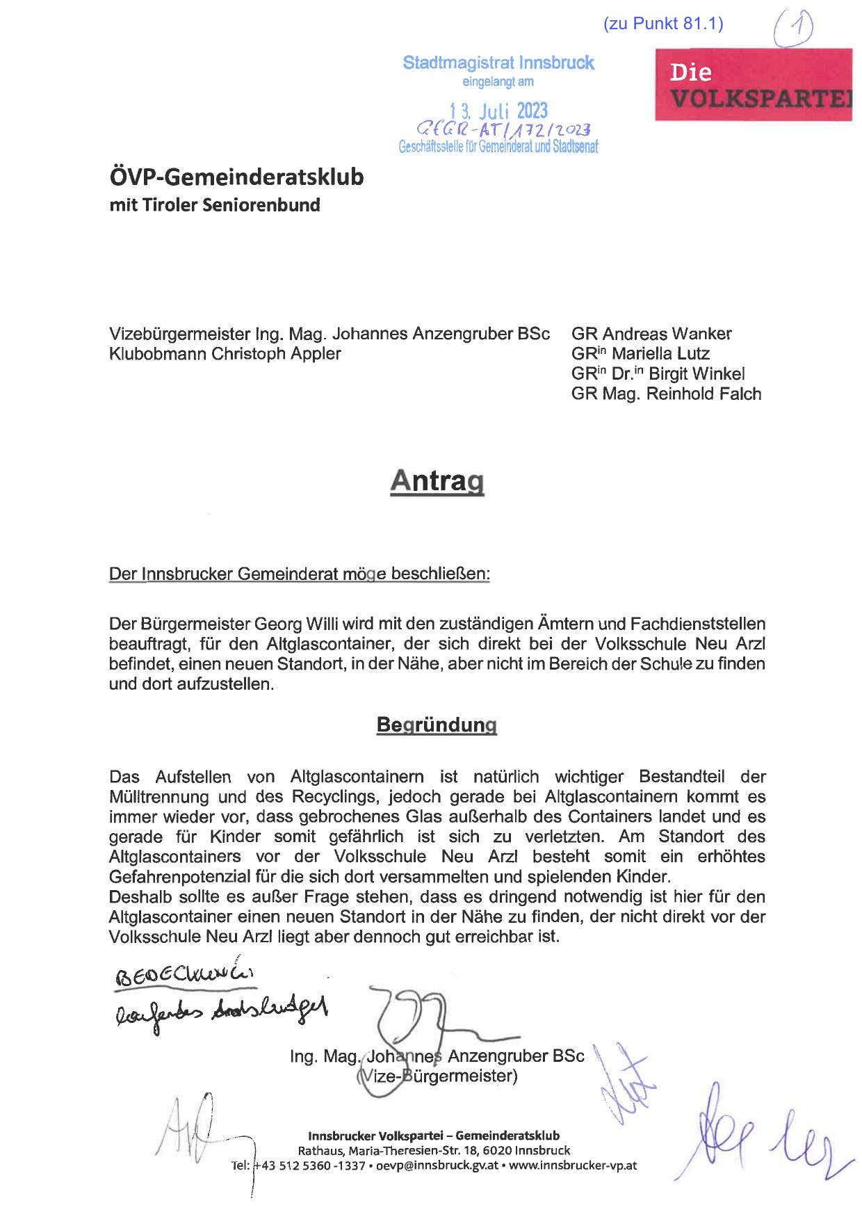 beauftragt, für den Altglascontainer, der sich direkt bei der Volksschule Neu Arzl