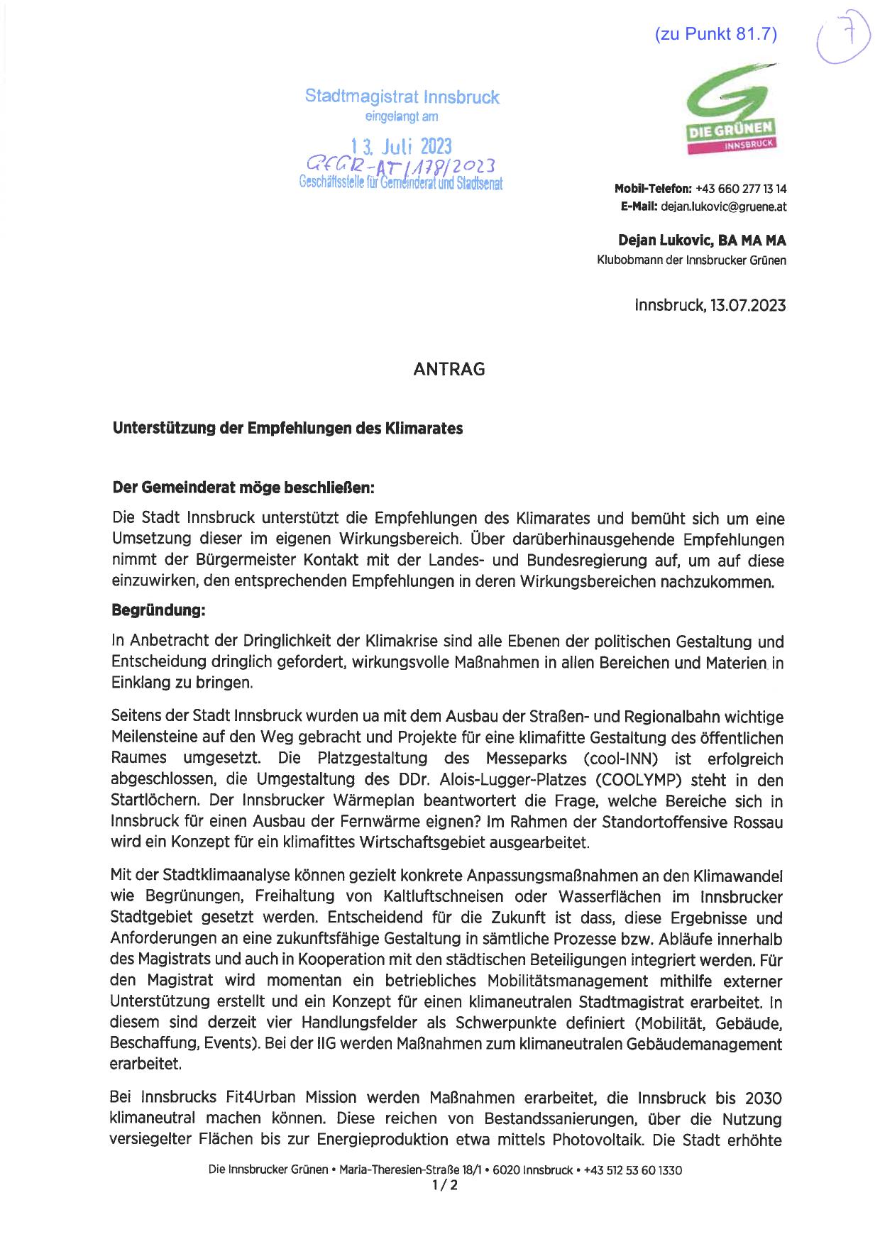 Die Stadt Innsbruck unterstützt die Empfehlungen des Klimarates und bemüht sich um eine