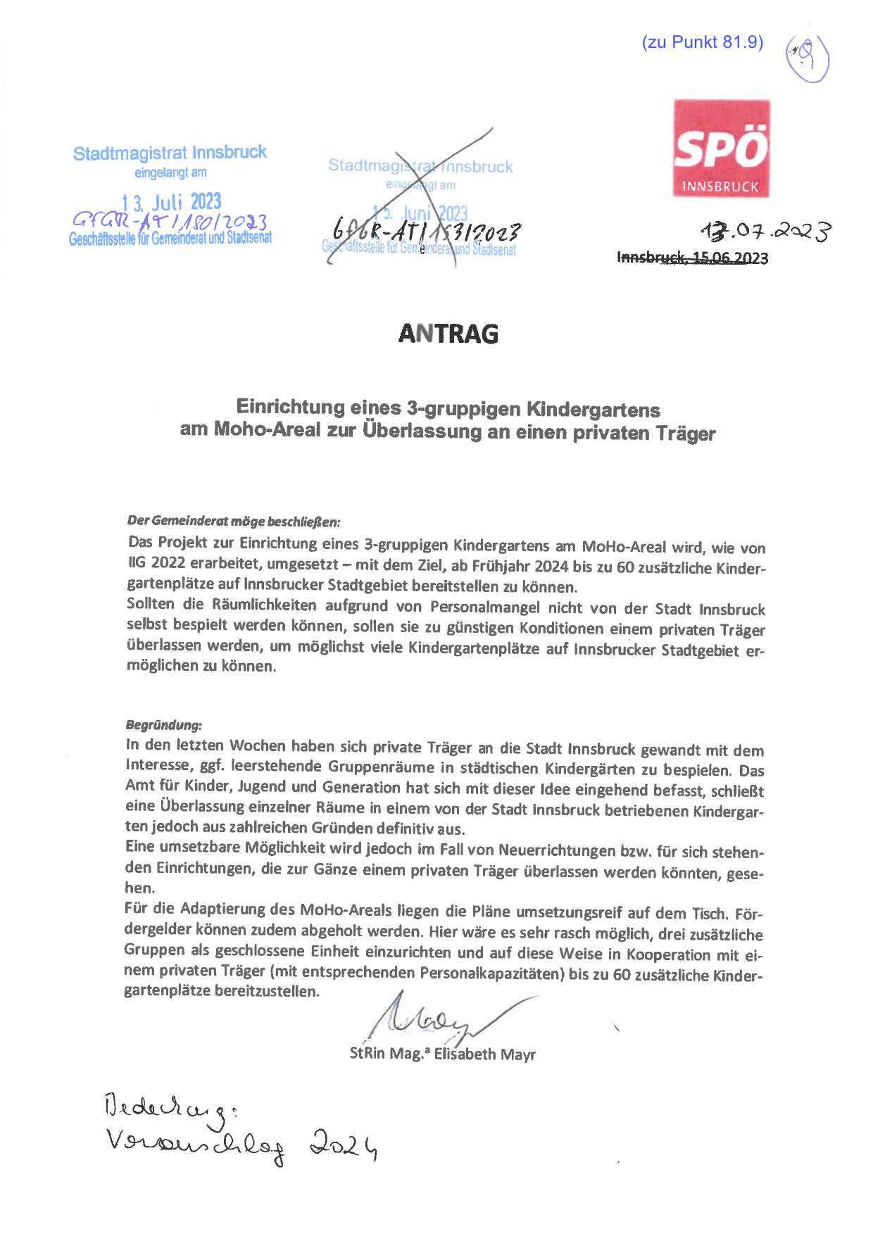 IIG 2022 erarbeitet, umgesetzt - mit dem Ziel, ab Frühjahr2024 bis zu 60zusätzliche Kindergartenplätze auf Innsbrucker Stadtgebiet bereitstellen zu können.