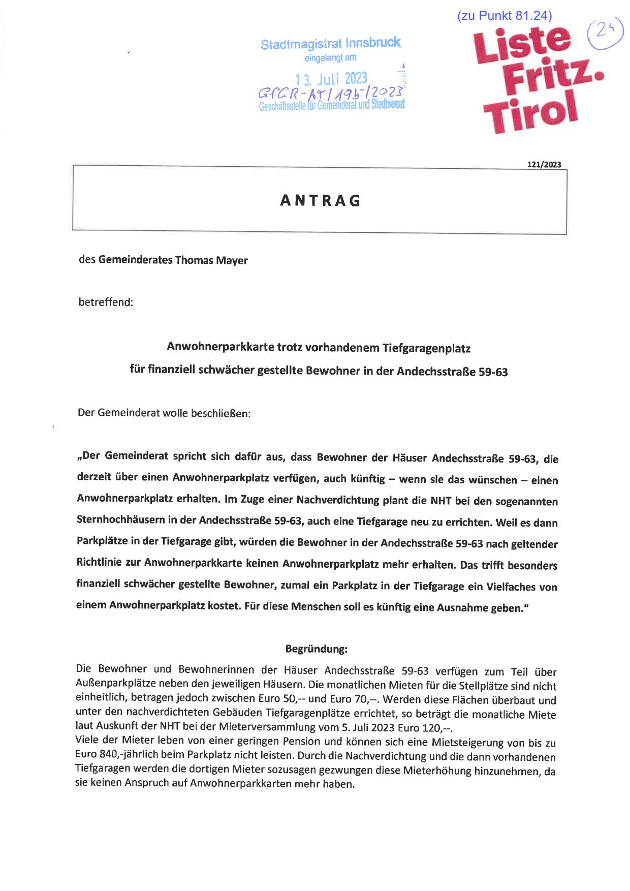 "Der Gemeinderat spricht sich dafür aus, dass Bewohner der Häuser Andechsstraße 59-63, die