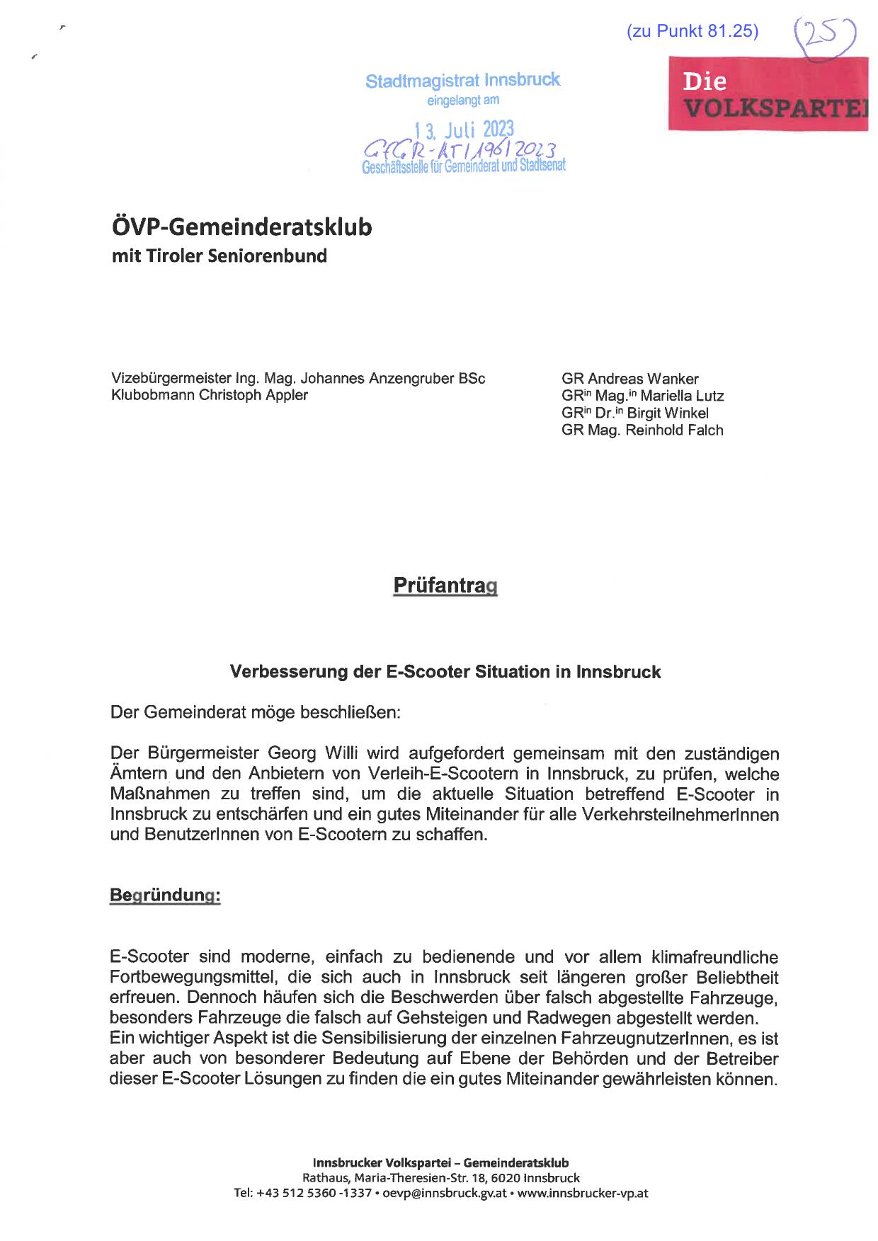 Ämtern und den Anbietern von Verleih-E-Scootern in Innsbruck, zu prüfen, welche
