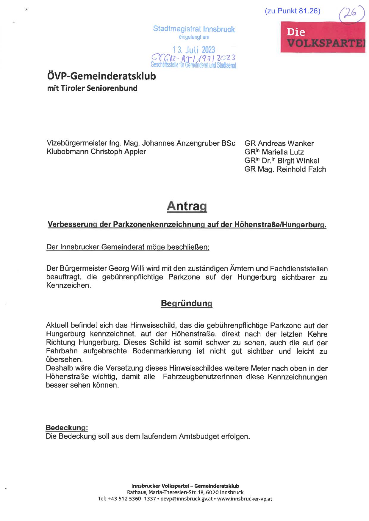 beauftragt, die gebührenpflichtige Parkzone auf der Hungerburg sichtbarer zu