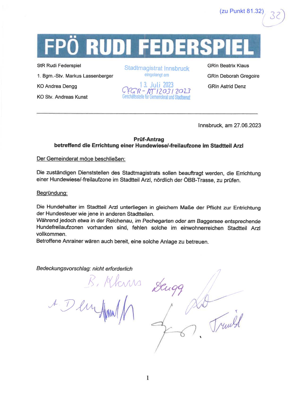 betreffend die Errichtung einer Hundewiese/-freilaufzone im Stadtteil Arzl