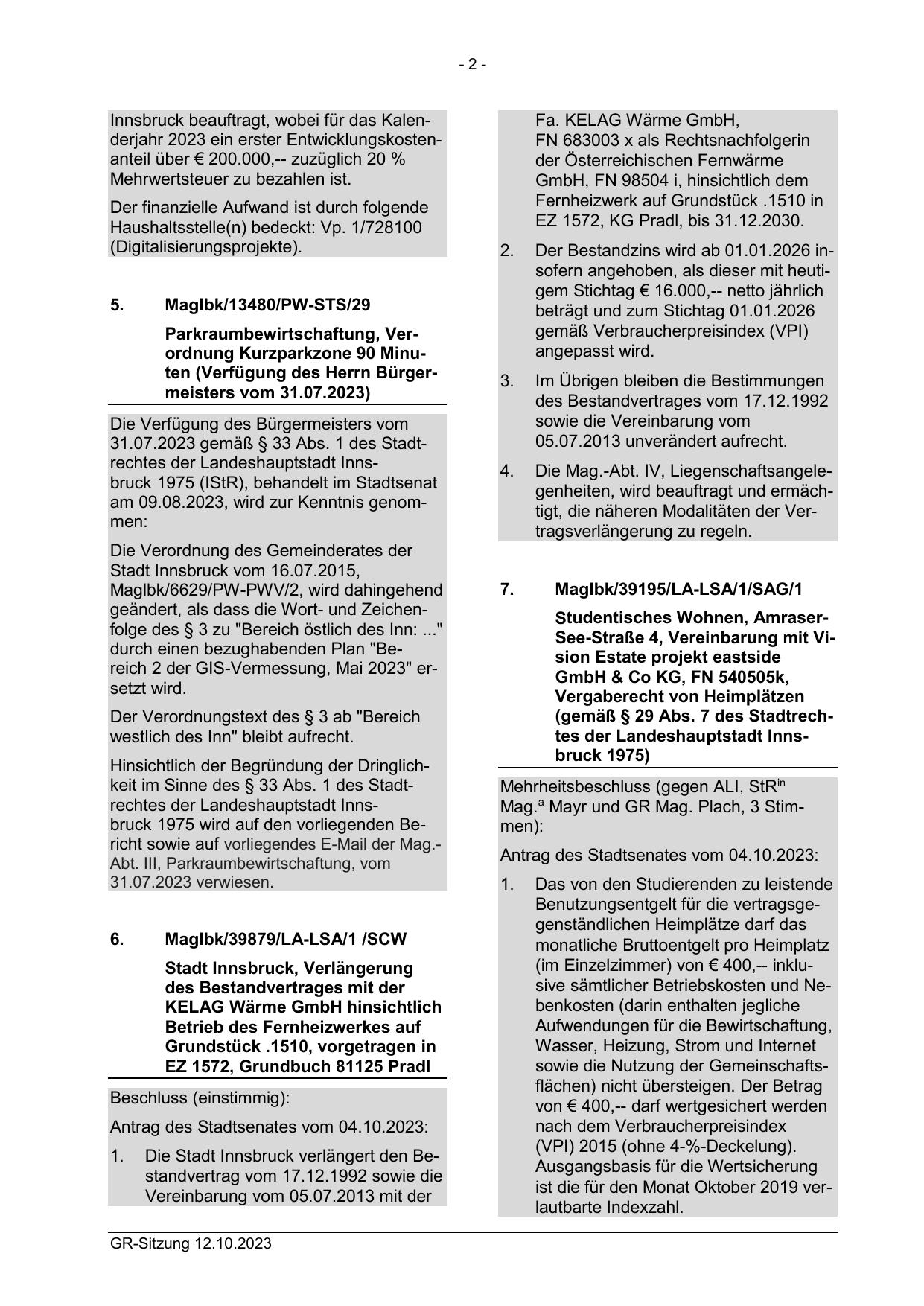 31.07.2023 gemäß § 33 Abs. 1 des Stadtrechtes der Landeshauptstadt Innsbruck 1975 (IStR), behandelt im Stadtsenat