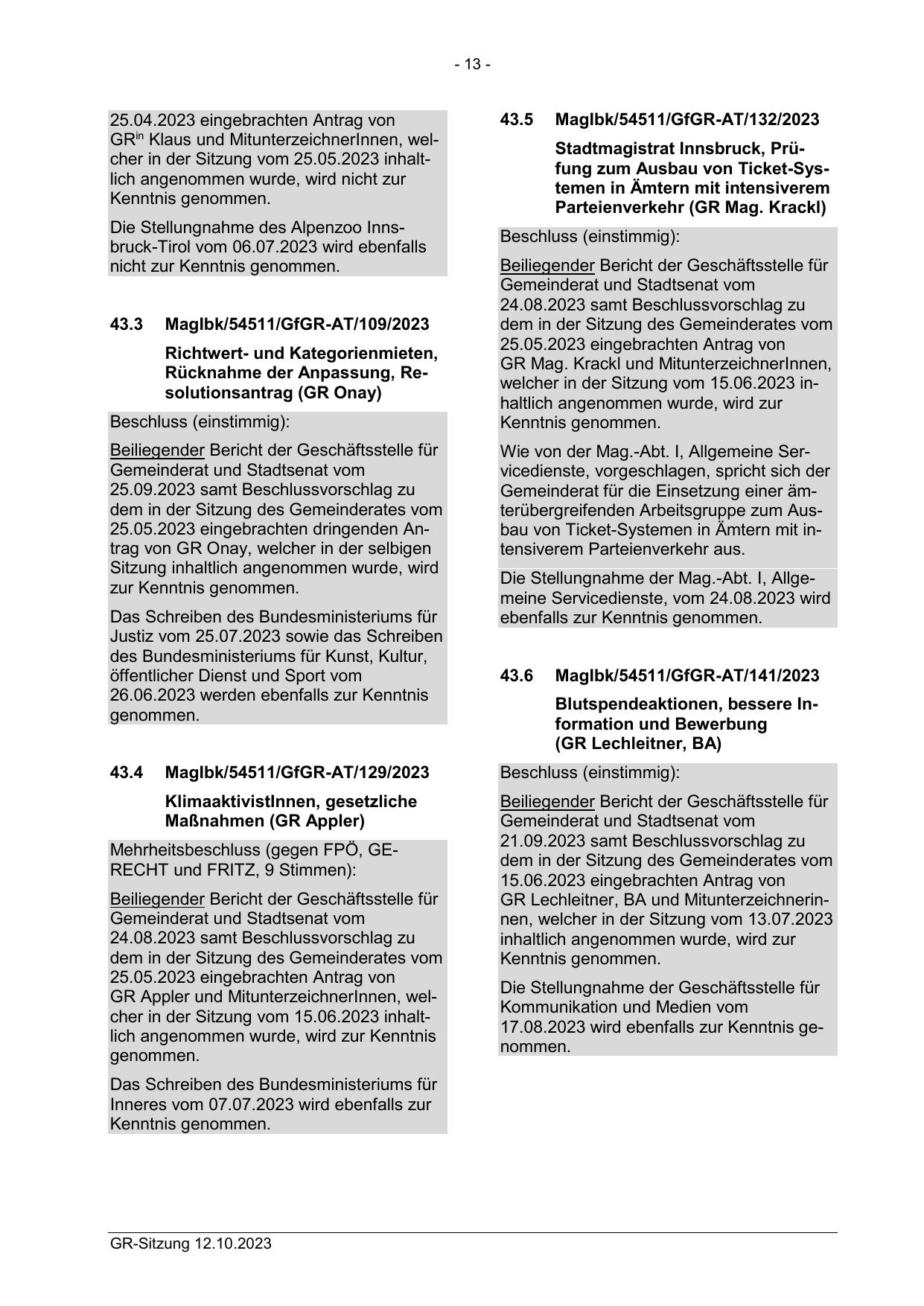 GR Lechleitner, BA und Mitunterzeichnerinnen, welcher in der Sitzung vom 13.07.2023