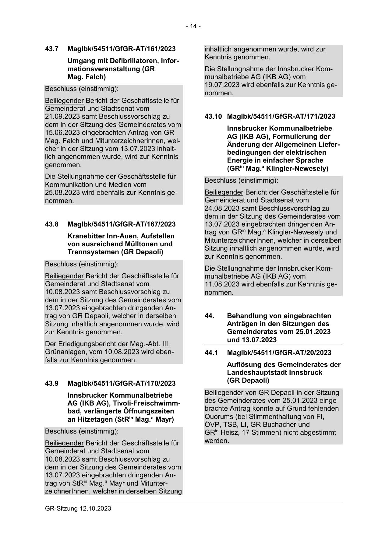 13.07.2023 eingebrachten dringenden Antrag von GR Depaoli, welcher in derselben